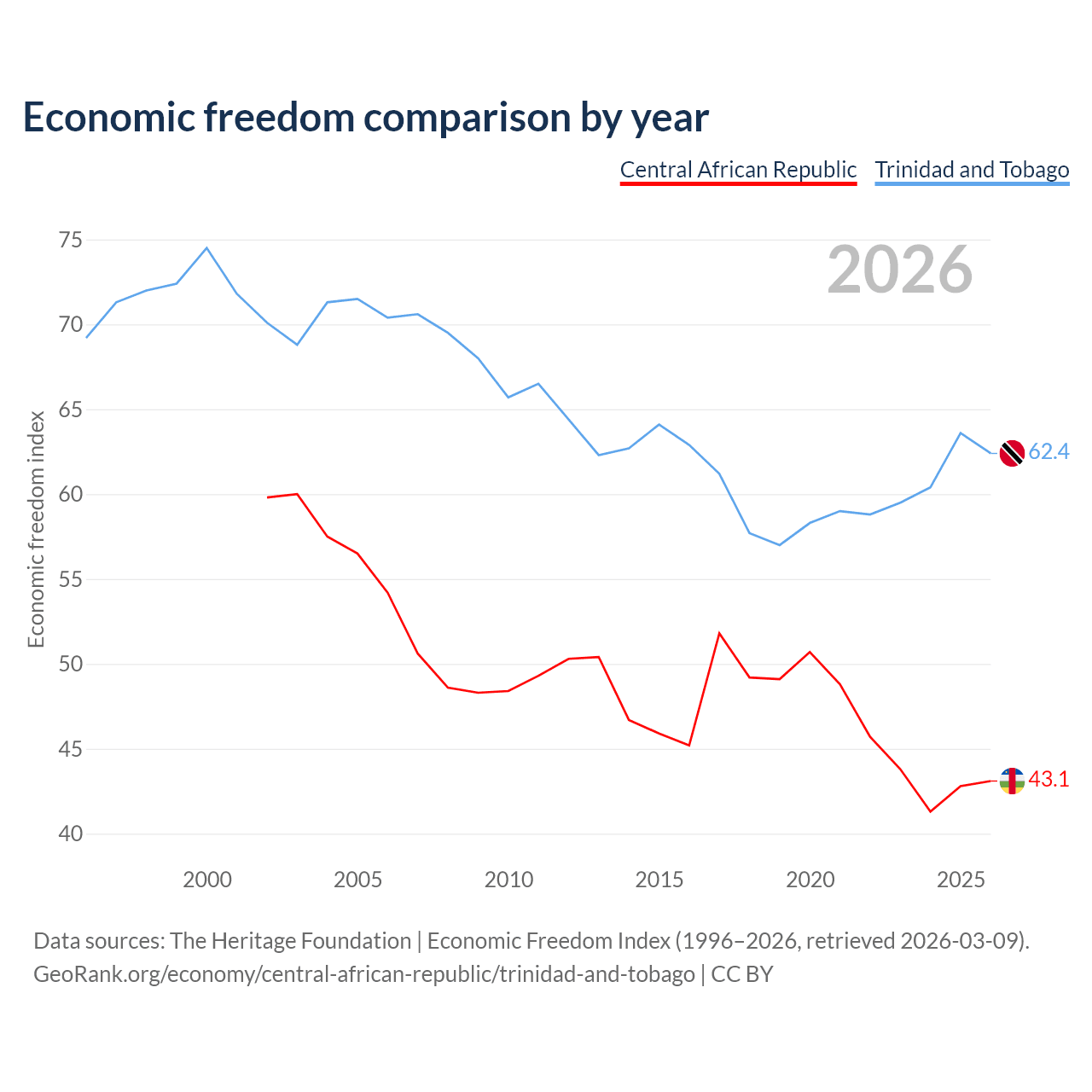 The Economic Freedom Index for the Central African Republic is 43.1, ranking 182/197, compared to 62.4 for Trinidad and Tobago, ranking 87/197. The chart above displays a comparison of annual changes in economic freedom indexes.