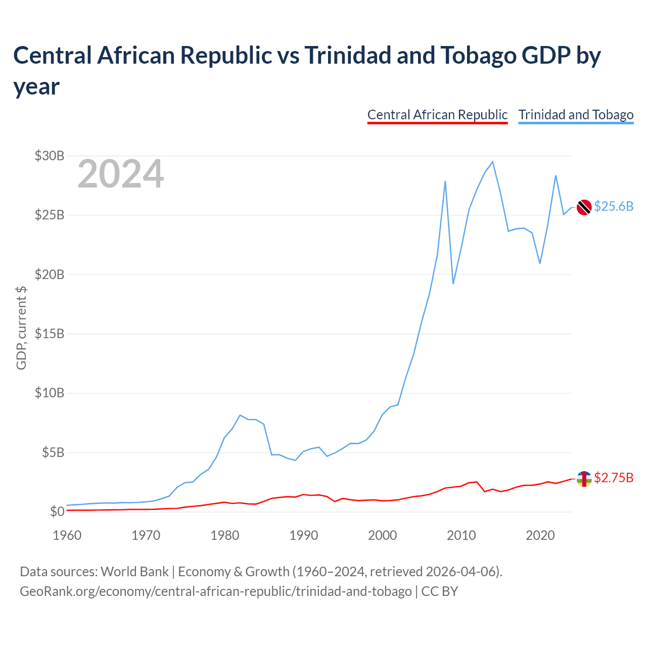 The Central African Republic has a GDP of $2.75B compared to $25.6B for Trinidad and Tobago, ranking 171/197 and 115/197 by economy size, respectively.