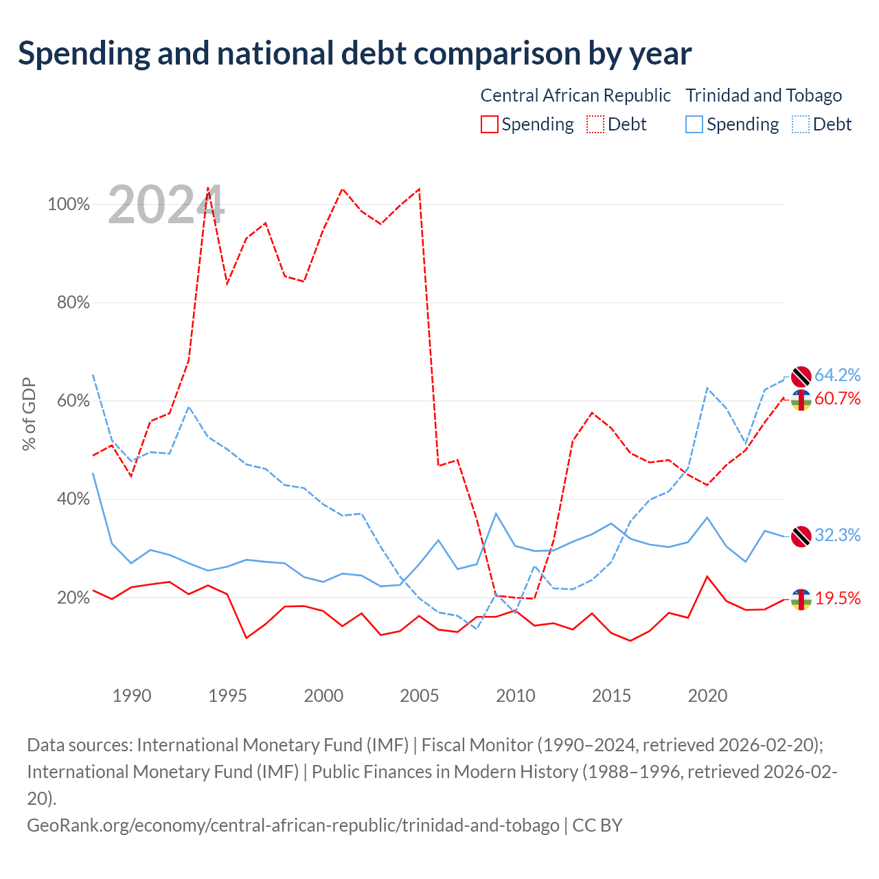 The Central African Republic has $1.67B in government debt (60.7% of GDP), compared to $16.5B (64.2% of GDP) in Trinidad and Tobago.