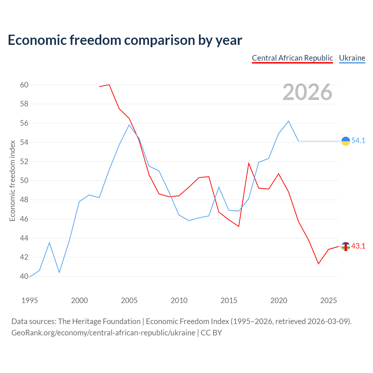 The Economic Freedom Index for the Central African Republic is 43.1, ranking 182/197, compared to 54.1 for Ukraine, ranking 135/197. The chart above displays a comparison of annual changes in economic freedom indexes.