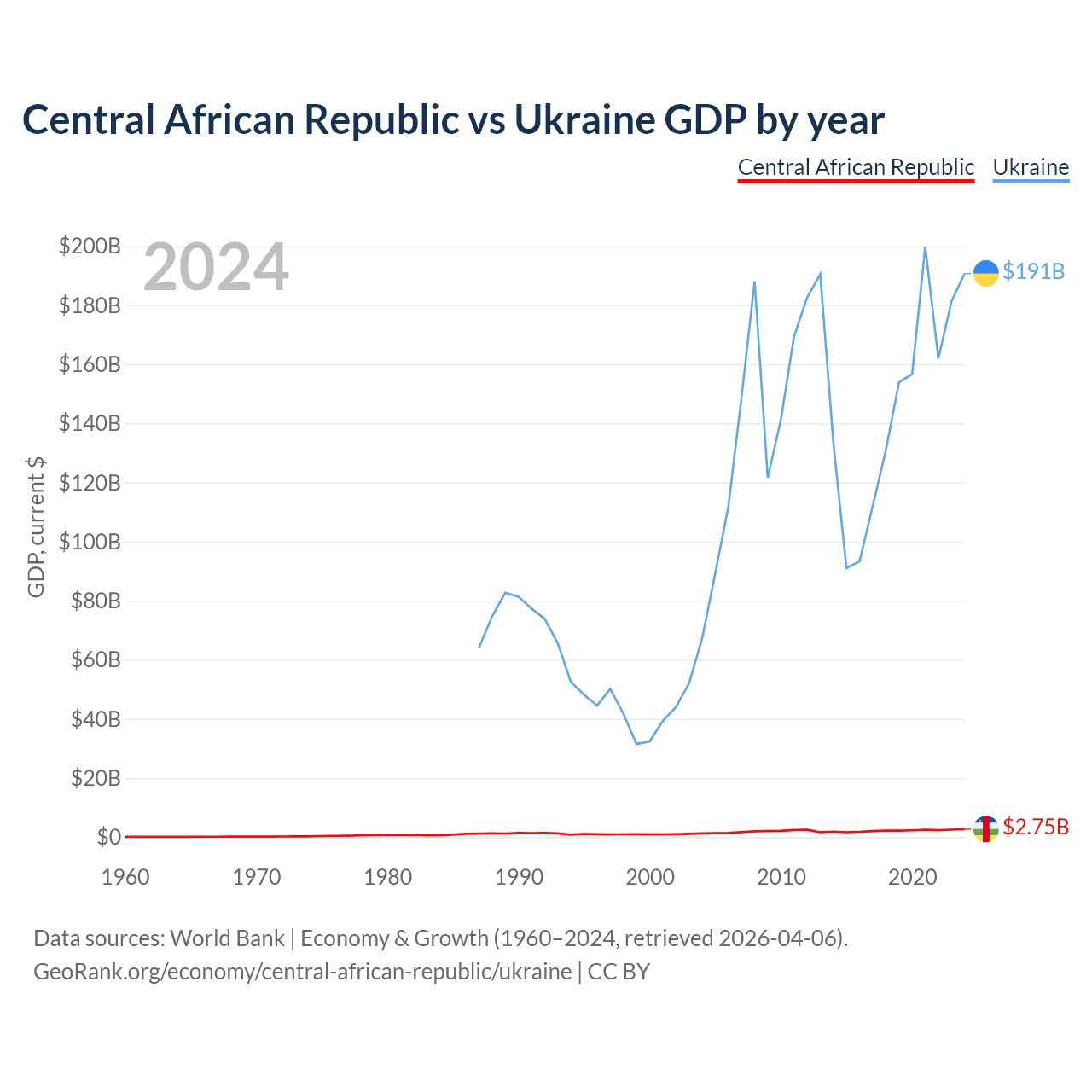 The Central African Republic has a GDP of $2.75B compared to $191B for Ukraine, ranking 171/197 and 57/197 by economy size, respectively.