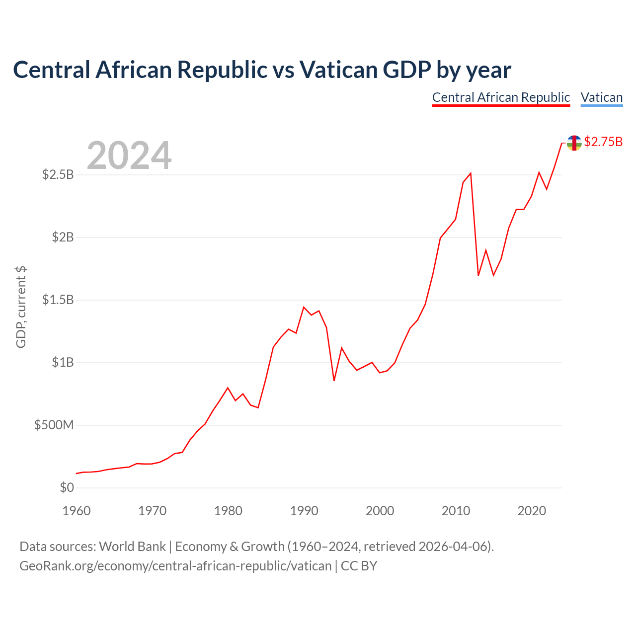 The Central African Republic has a GDP of $2.75B compared to $19.8M for the Vatican, ranking 171/197 and 197/197 by economy size, respectively.