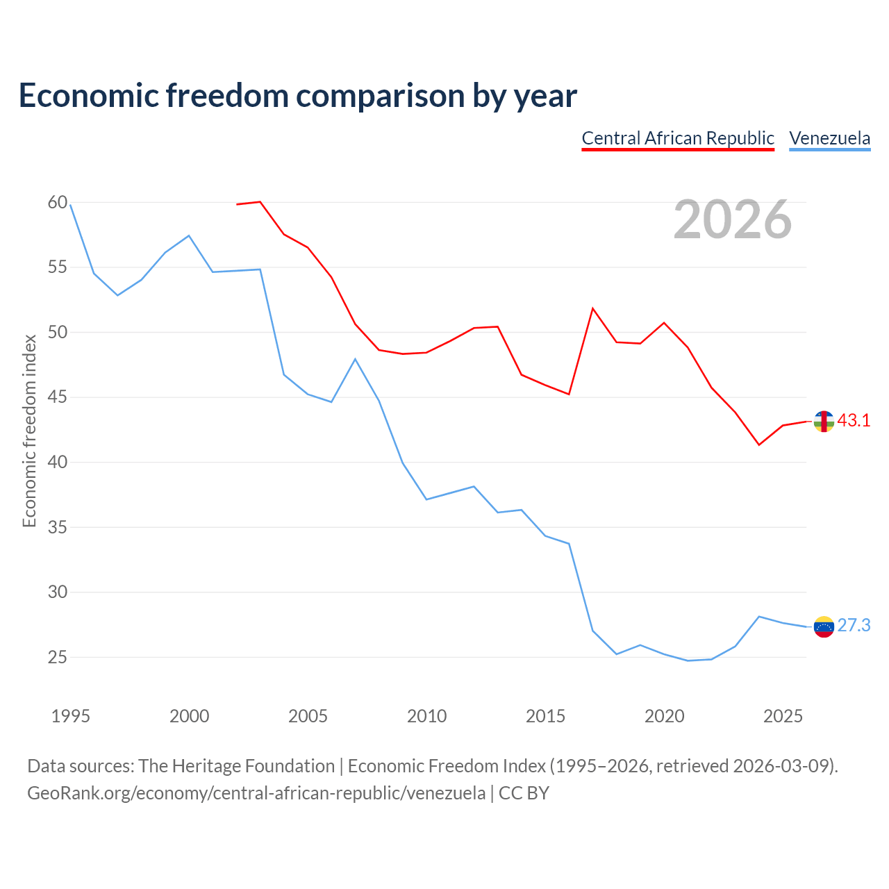 The Economic Freedom Index for the Central African Republic is 43.1, ranking 182/197, compared to 27.3 for Venezuela, ranking 194/197. The chart above displays a comparison of annual changes in economic freedom indexes.