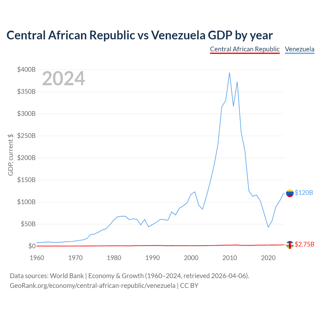 The Central African Republic has a GDP of $2.75B compared to $120B for Venezuela, ranking 171/197 and 65/197 by economy size, respectively.