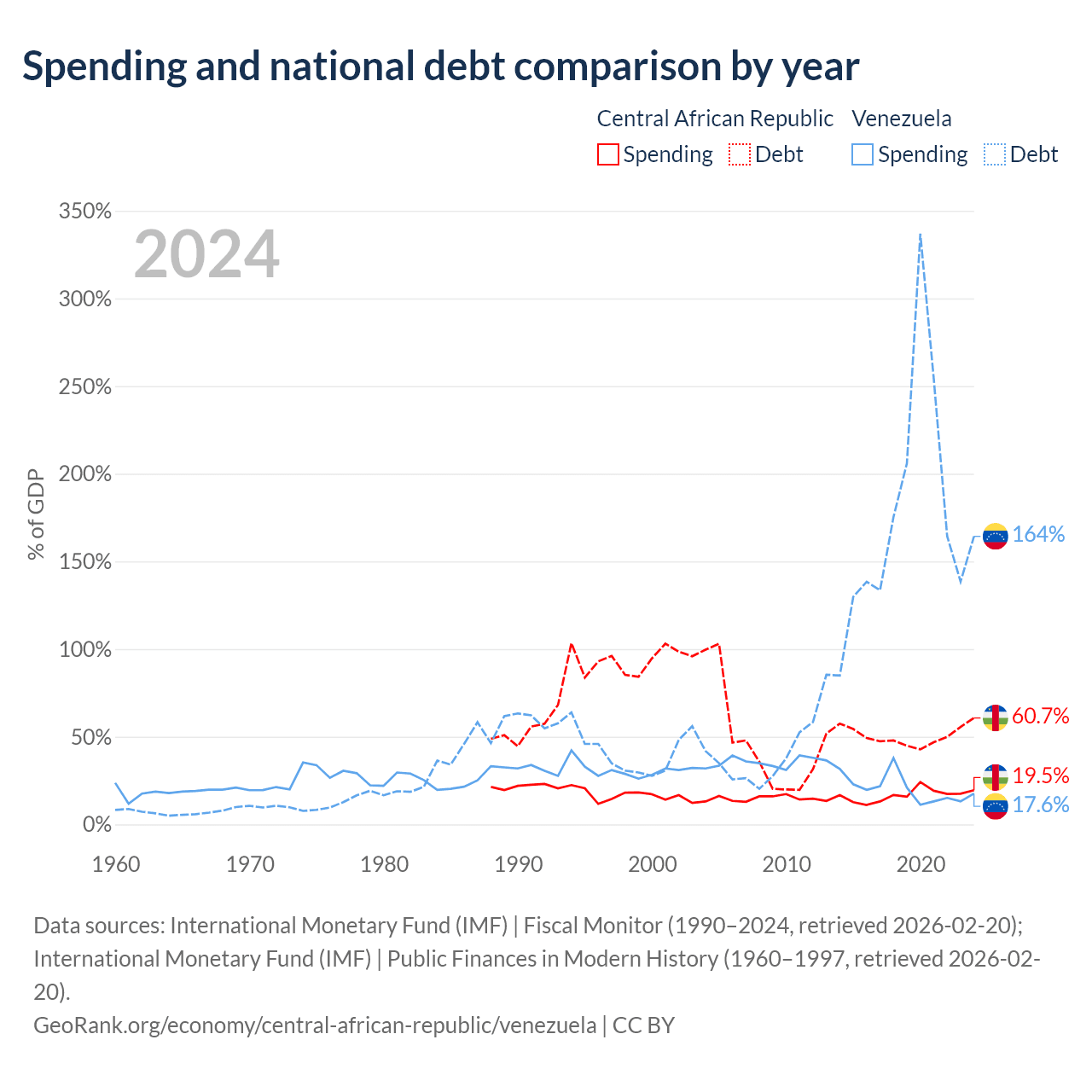 The Central African Republic has $1.67B in government debt (60.7% of GDP), compared to $197B (164.3% of GDP) in Venezuela.