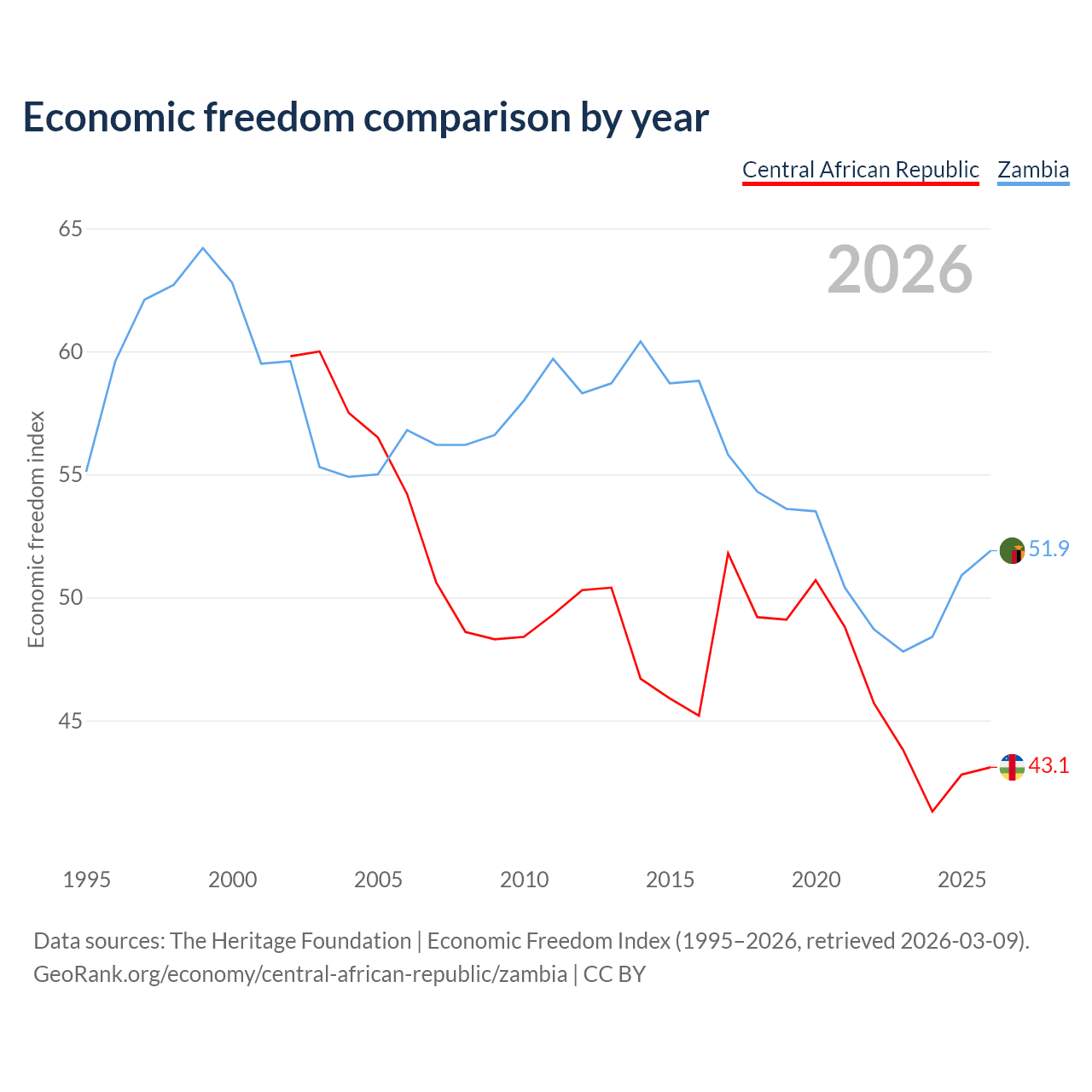 The Economic Freedom Index for the Central African Republic is 43.1, ranking 182/197, compared to 51.9 for Zambia, ranking 152/197. The chart above displays a comparison of annual changes in economic freedom indexes.