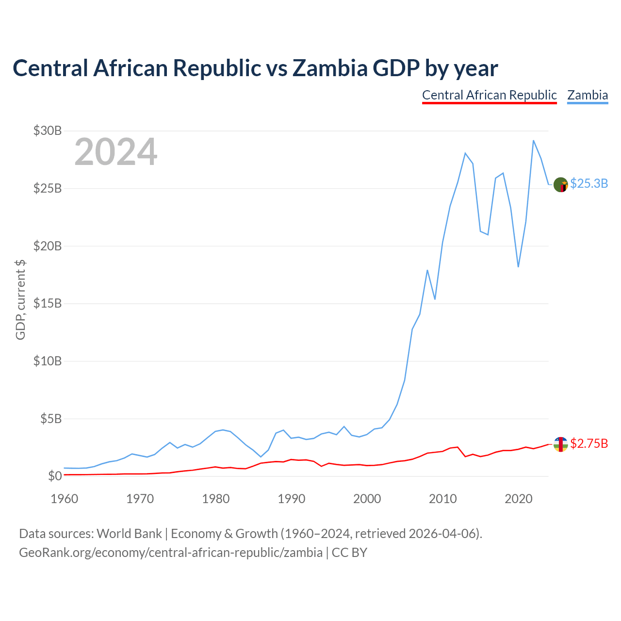 The Central African Republic has a GDP of $2.75B compared to $25.3B for Zambia, ranking 171/197 and 116/197 by economy size, respectively.