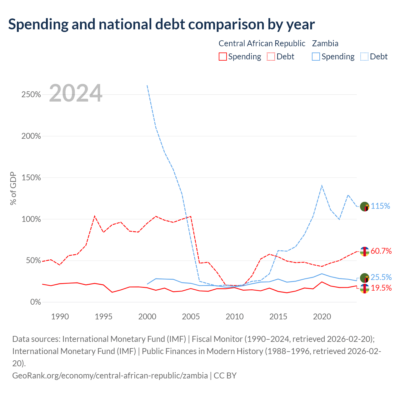 The Central African Republic has $1.67B in government debt (60.7% of GDP), compared to $29.1B (114.9% of GDP) in Zambia.