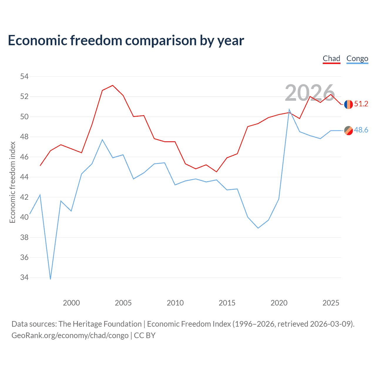 The Economic Freedom Index for Chad is 51.2, ranking 154/197, compared to 48.6 for the Congo, ranking 169/197. The chart above displays a comparison of annual changes in economic freedom indexes.