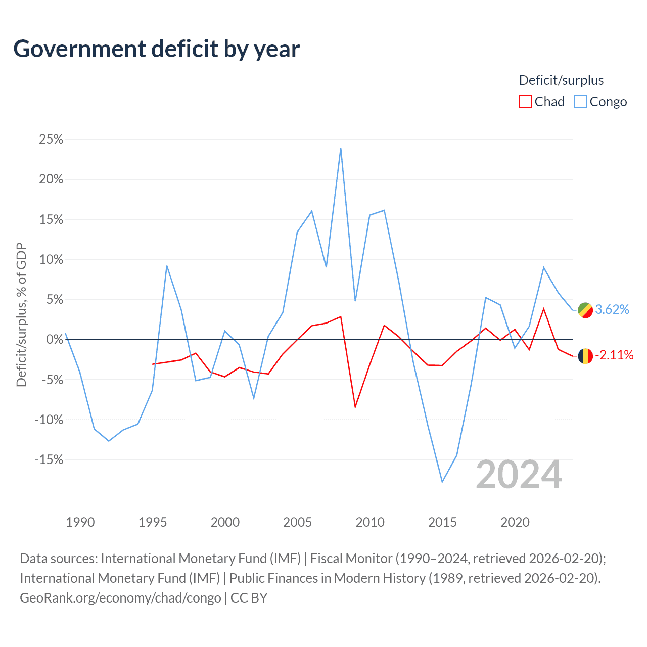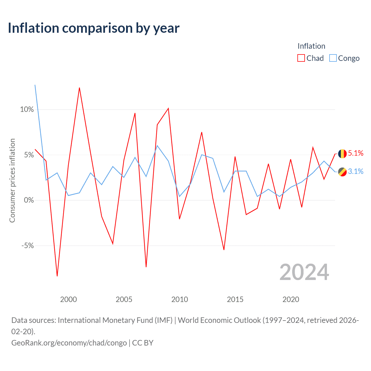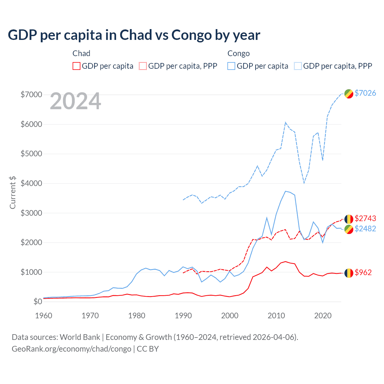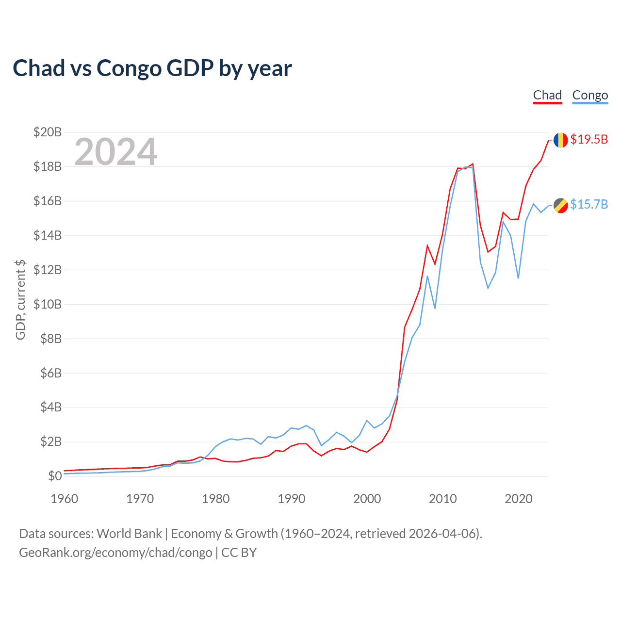 Chad has a GDP of $19.5B compared to $15.7B for the Congo, ranking 132/197 and 141/197 by economy size, respectively.