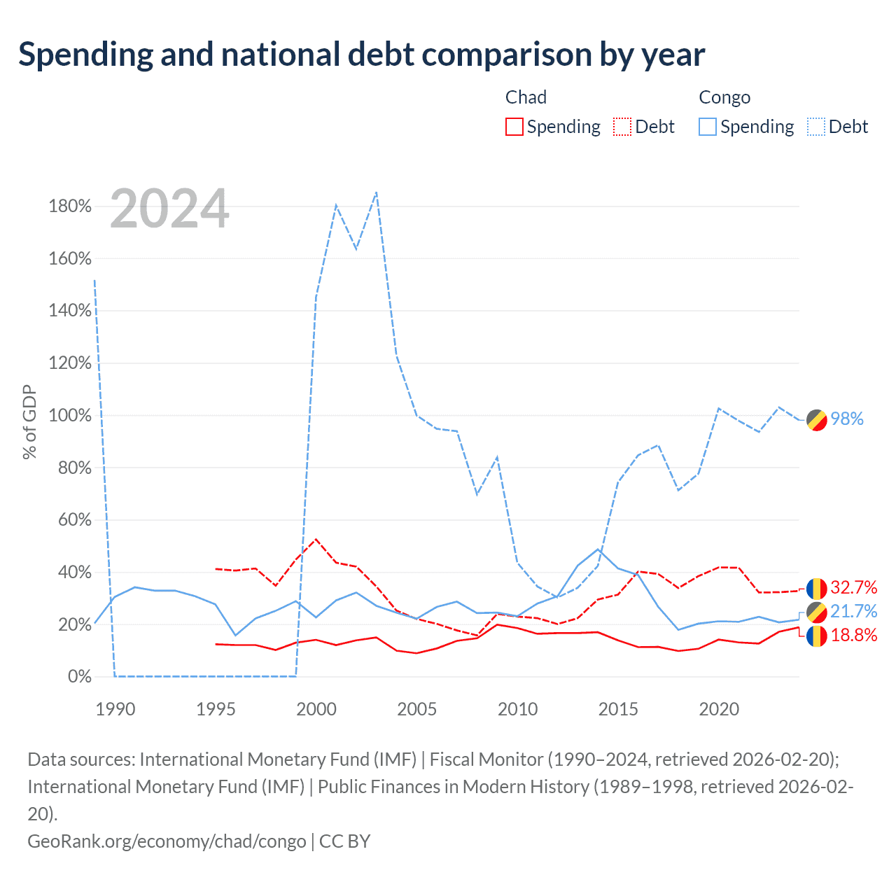 Chad has $6.37B in government debt (32.7% of GDP), compared to $15.4B (98% of GDP) in the Congo.
