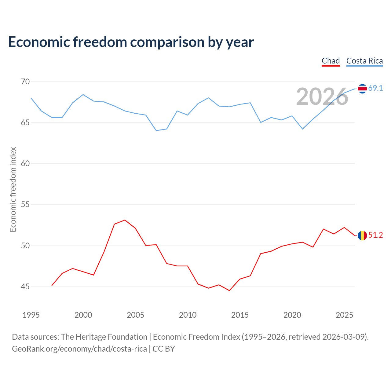 The Economic Freedom Index for Chad is 51.2, ranking 154/197, compared to 69.1 for Costa Rica, ranking 43/197. The chart above displays a comparison of annual changes in economic freedom indexes.