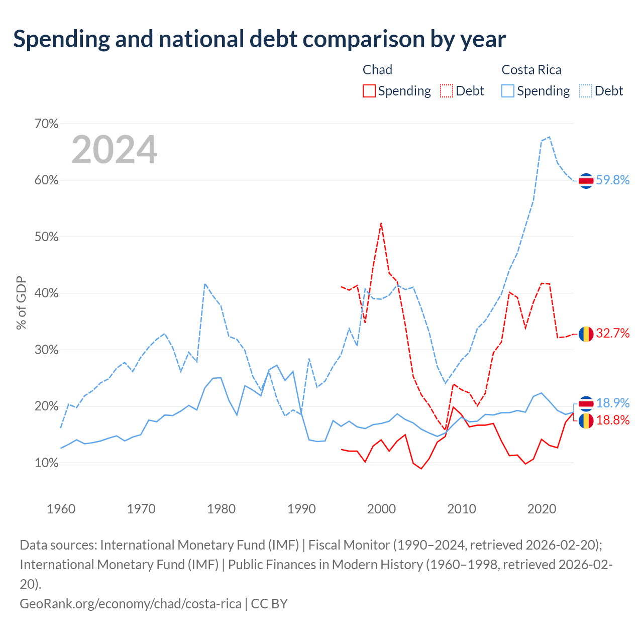 Chad has $6.37B in government debt (32.7% of GDP), compared to $57B (59.8% of GDP) in Costa Rica.