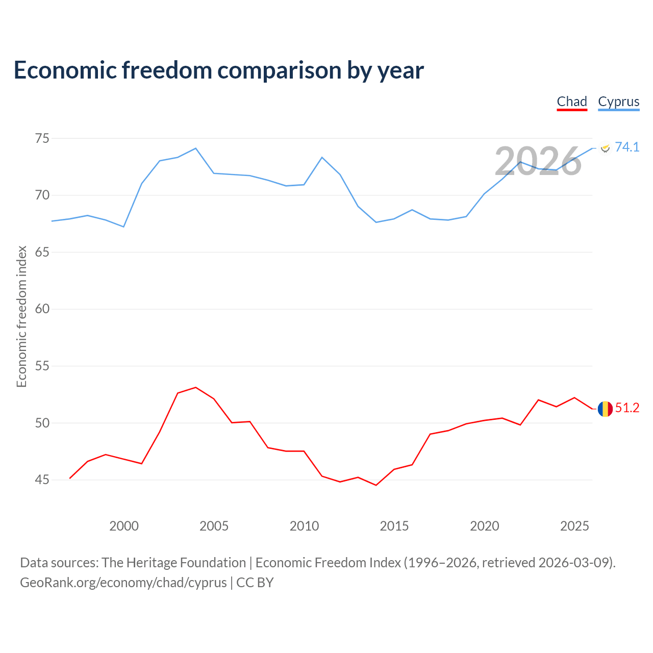 The Economic Freedom Index for Chad is 51.2, ranking 154/197, compared to 74.1 for Cyprus, ranking 21/197. The chart above displays a comparison of annual changes in economic freedom indexes.