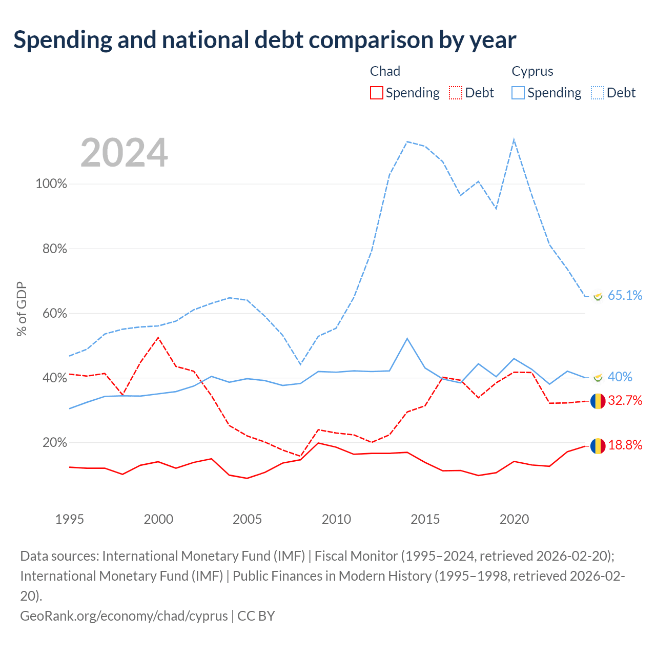 Chad has $6.37B in government debt (32.7% of GDP), compared to $24.5B (65.1% of GDP) in Cyprus.