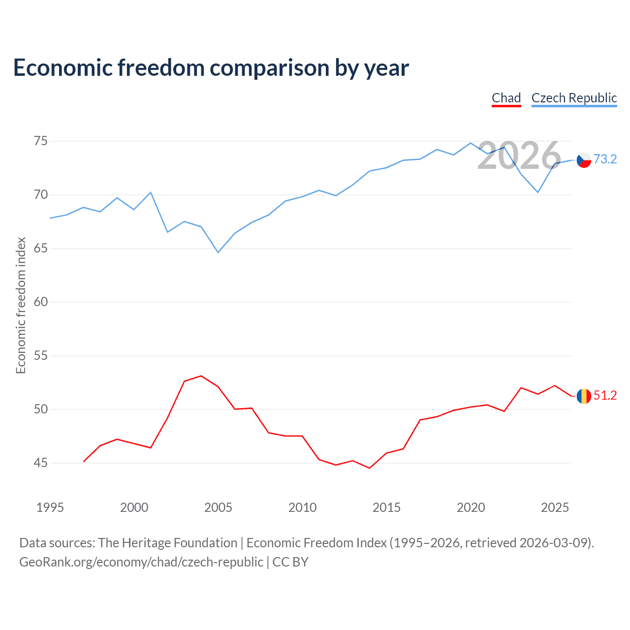 The Economic Freedom Index for Chad is 51.2, ranking 154/197, compared to 73.2 for the Czech Republic, ranking 25/197. The chart above displays a comparison of annual changes in economic freedom indexes.