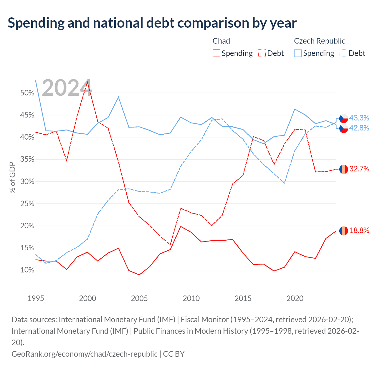 Chad has $6.37B in government debt (32.7% of GDP), compared to $150B (43.3% of GDP) in the Czech Republic.