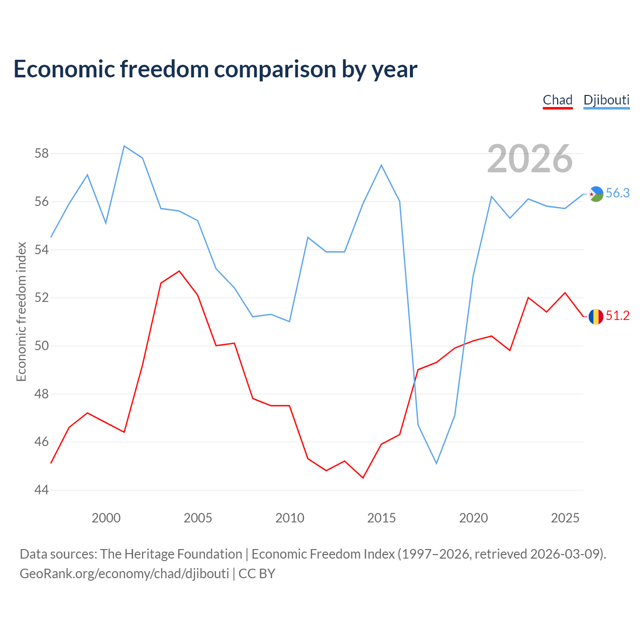 The Economic Freedom Index for Chad is 51.2, ranking 154/197, compared to 56.3 for Djibouti, ranking 122/197. The chart above displays a comparison of annual changes in economic freedom indexes.