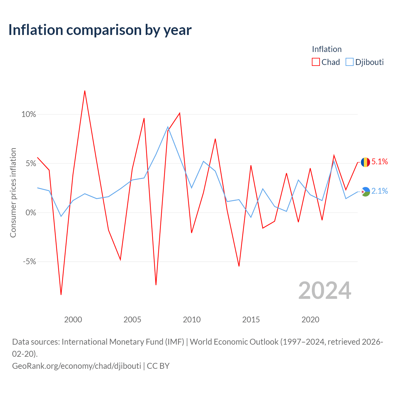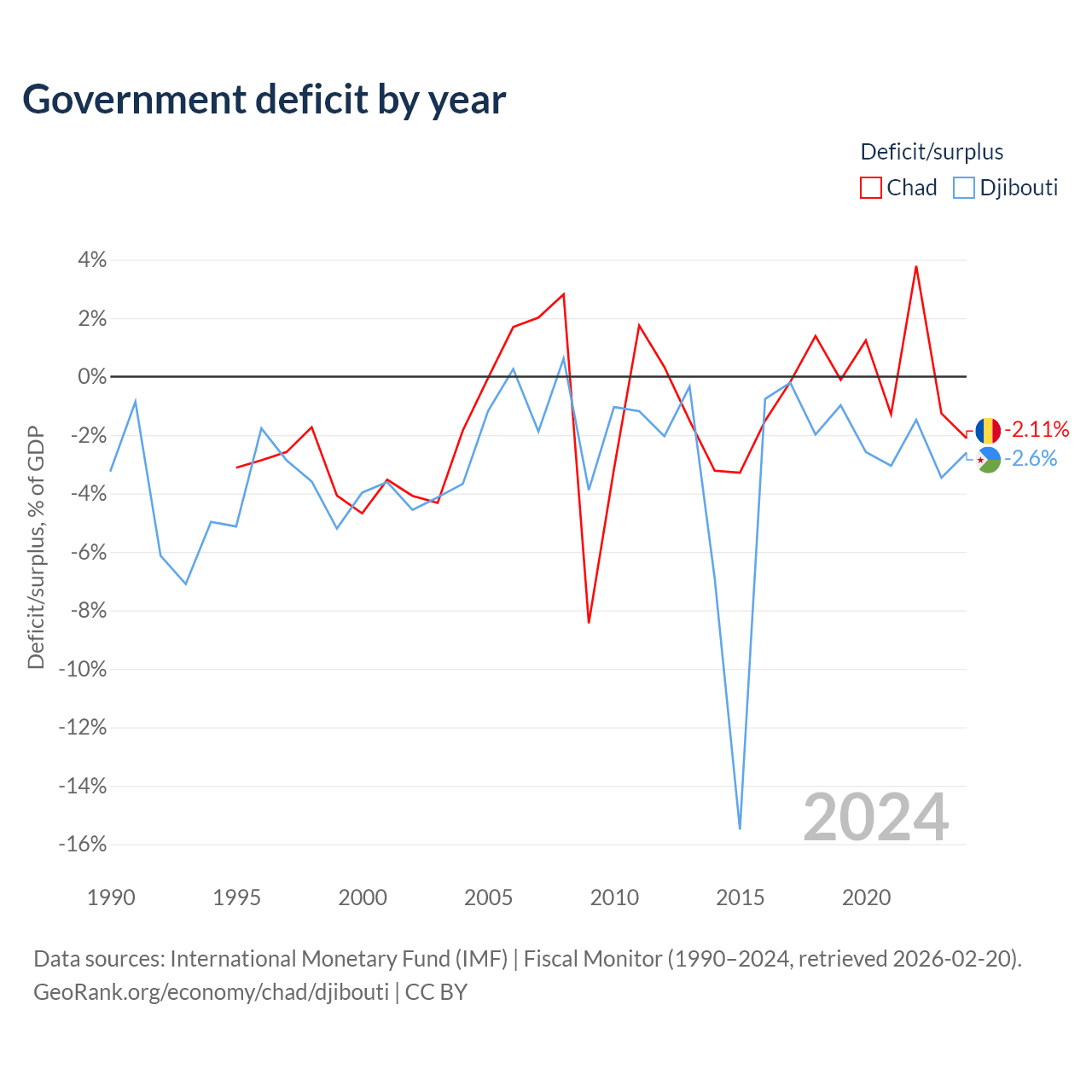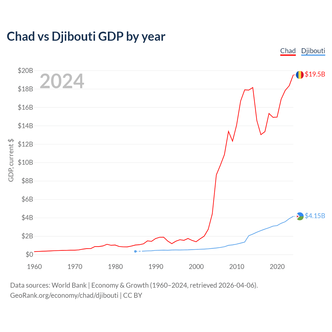Chad has a GDP of $19.5B compared to $4.15B for Djibouti, ranking 132/197 and 165/197 by economy size, respectively.