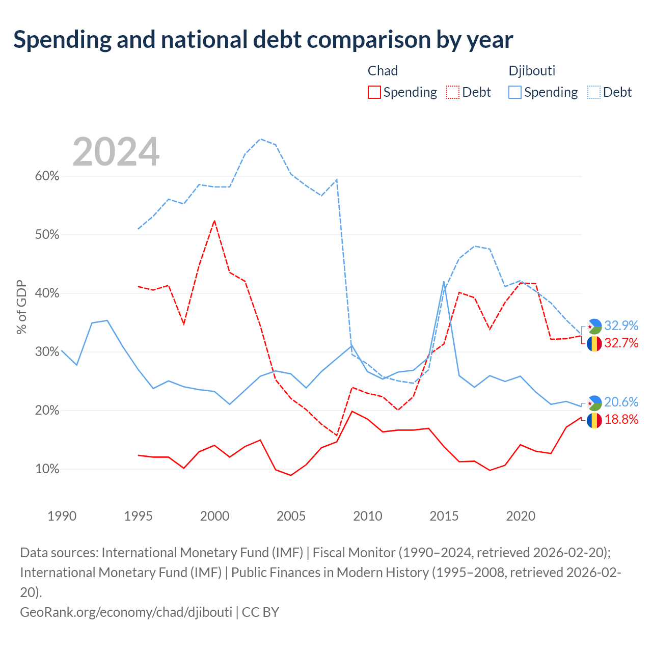 Chad has $6.37B in government debt (32.7% of GDP), compared to $1.36B (32.9% of GDP) in Djibouti.