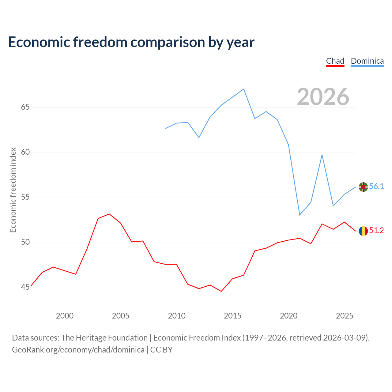 The Economic Freedom Index for Chad is 51.2, ranking 154/197, compared to 56.1 for Dominica, ranking 124/197. The chart above displays a comparison of annual changes in economic freedom indexes.