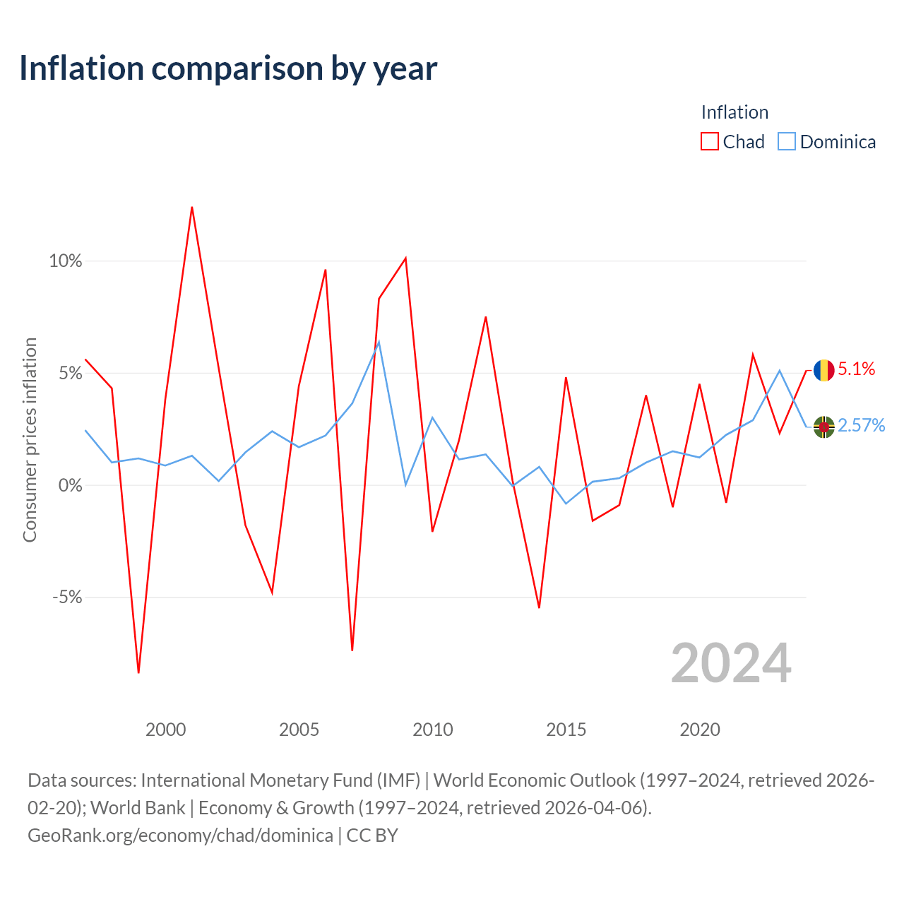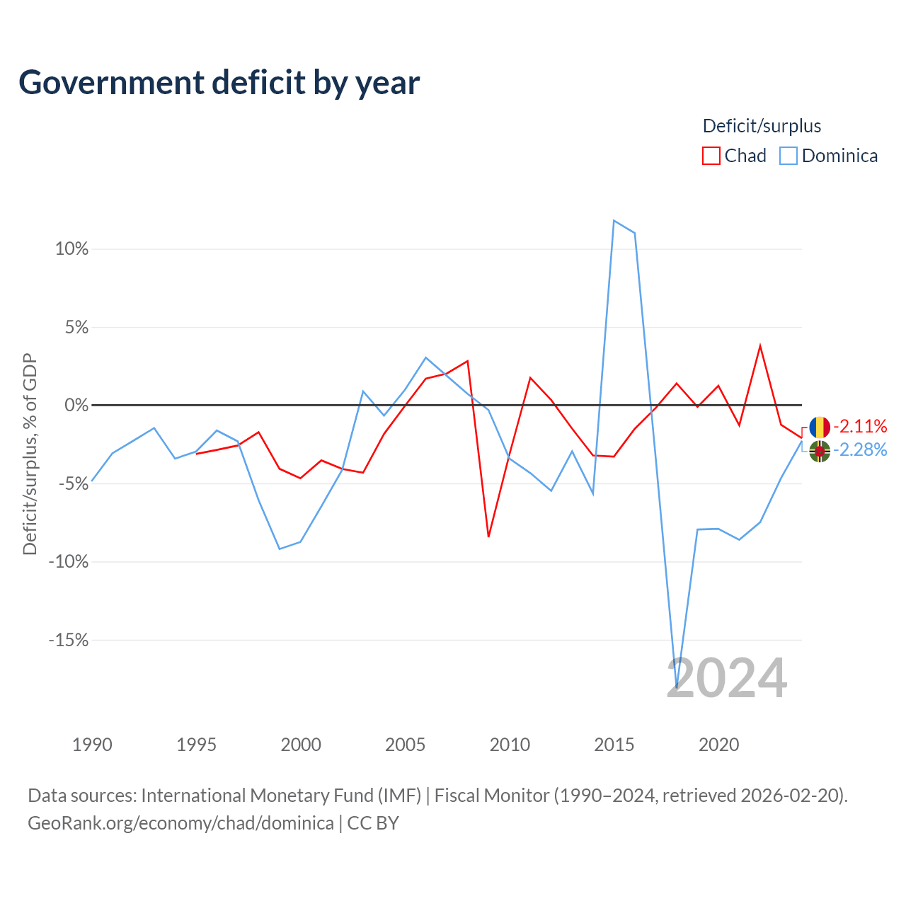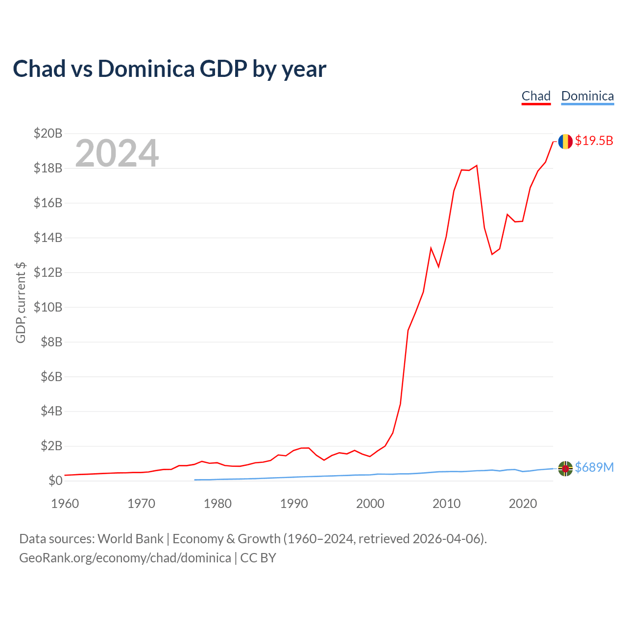 Chad has a GDP of $19.5B compared to $689M for Dominica, ranking 132/197 and 190/197 by economy size, respectively.
