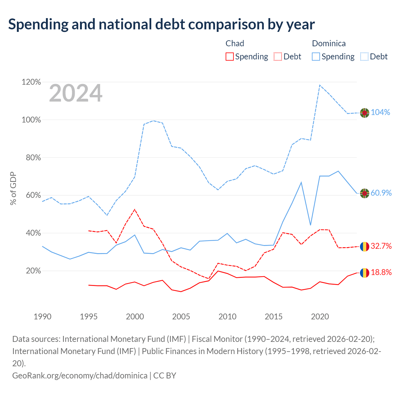 Chad has $6.37B in government debt (32.7% of GDP), compared to $713M (103.5% of GDP) in Dominica.