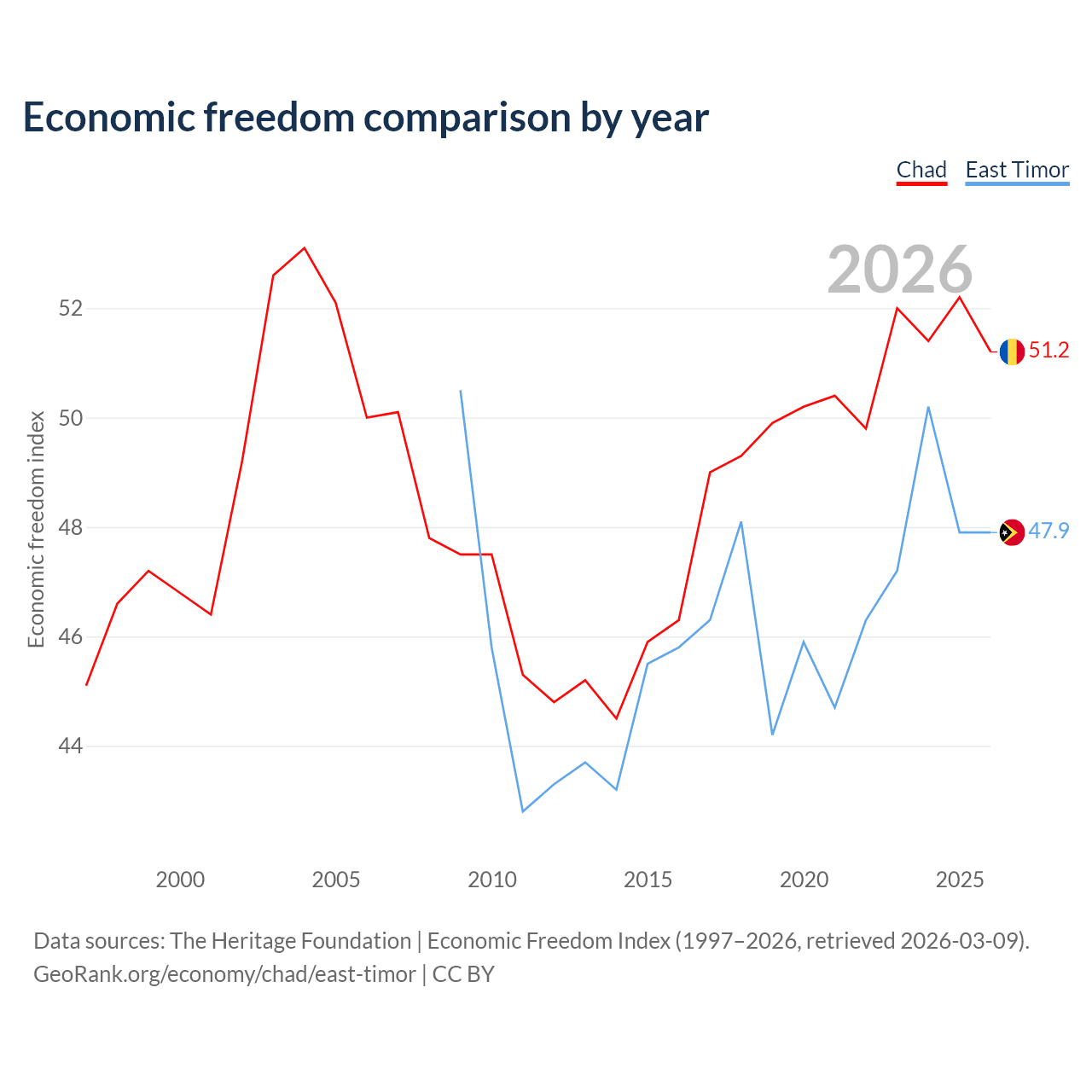 The Economic Freedom Index for Chad is 51.2, ranking 154/197, compared to 47.9 for East Timor, ranking 173/197. The chart above displays a comparison of annual changes in economic freedom indexes.