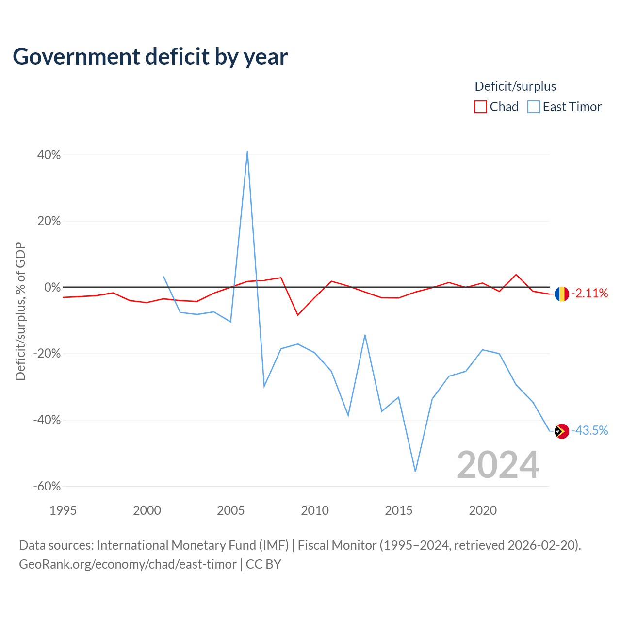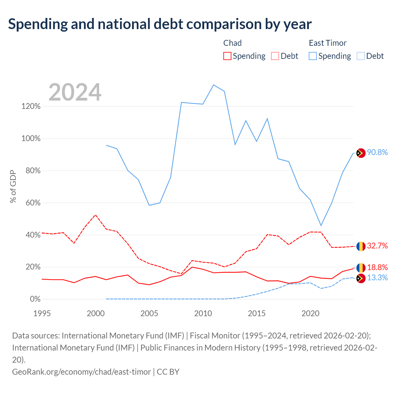 Chad has $6.37B in government debt (32.7% of GDP), compared to $249M (13.3% of GDP) in East Timor.