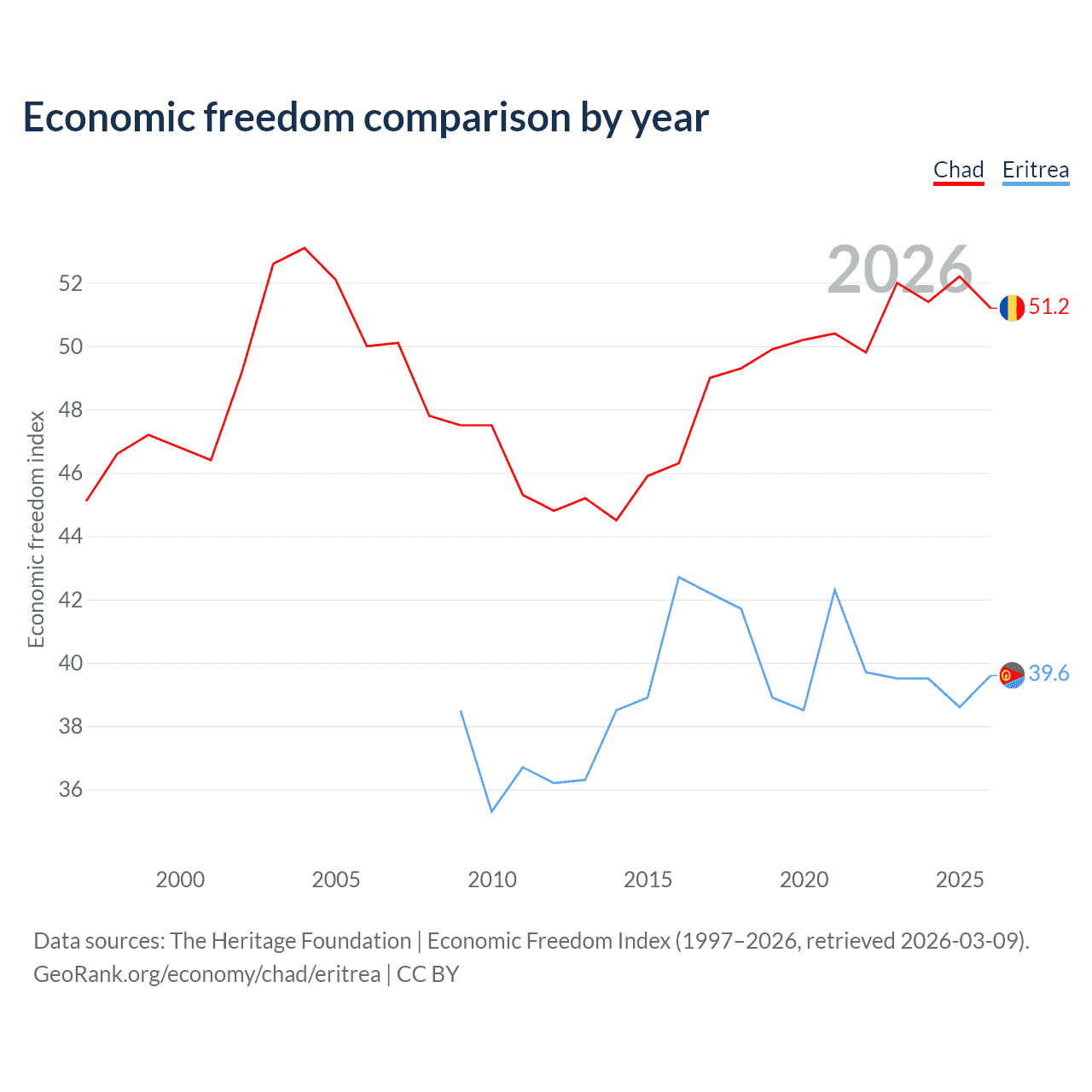 The Economic Freedom Index for Chad is 51.2, ranking 154/197, compared to 39.6 for Eritrea, ranking 188/197. The chart above displays a comparison of annual changes in economic freedom indexes.