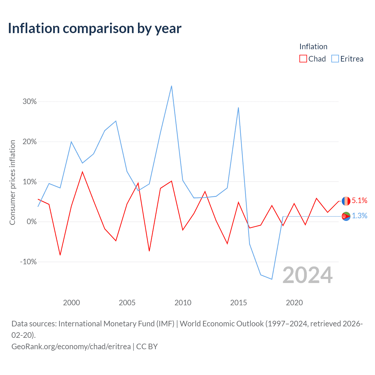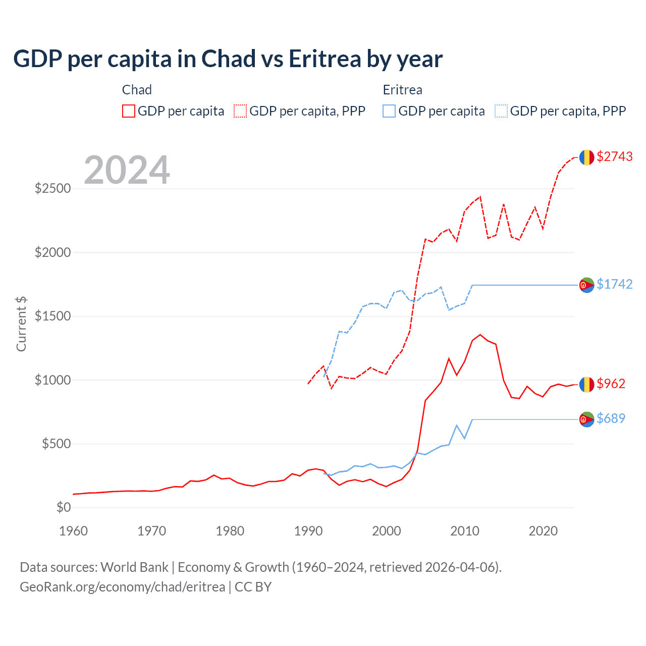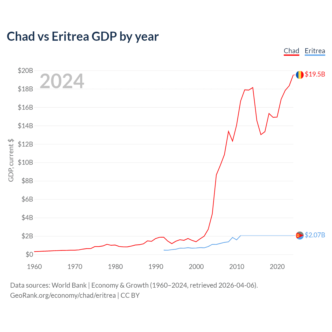 Chad has a GDP of $19.5B compared to $2.07B for Eritrea, ranking 132/197 and 179/197 by economy size, respectively.