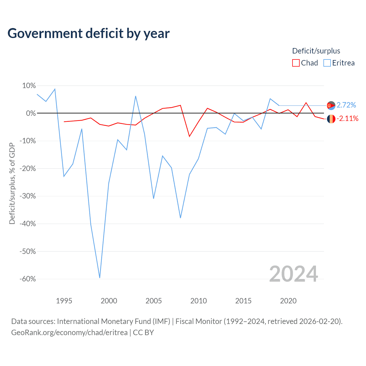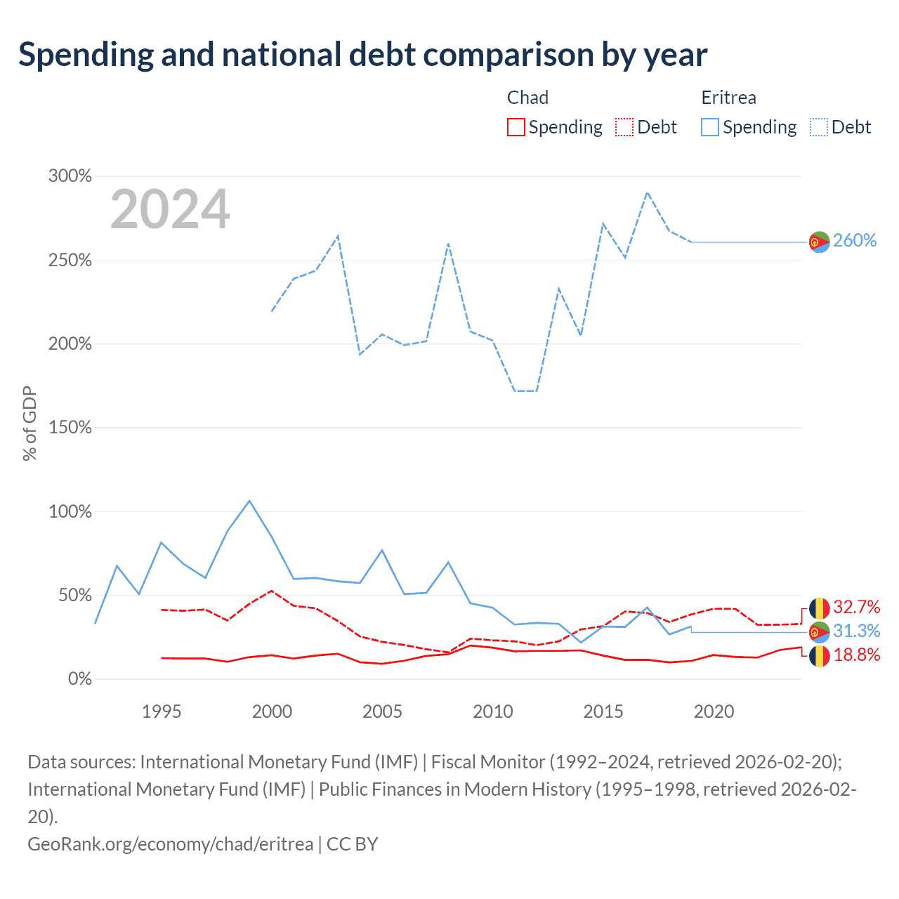 Chad has $6.37B in government debt (32.7% of GDP), compared to $3.54B (260.4% of GDP) in Eritrea.