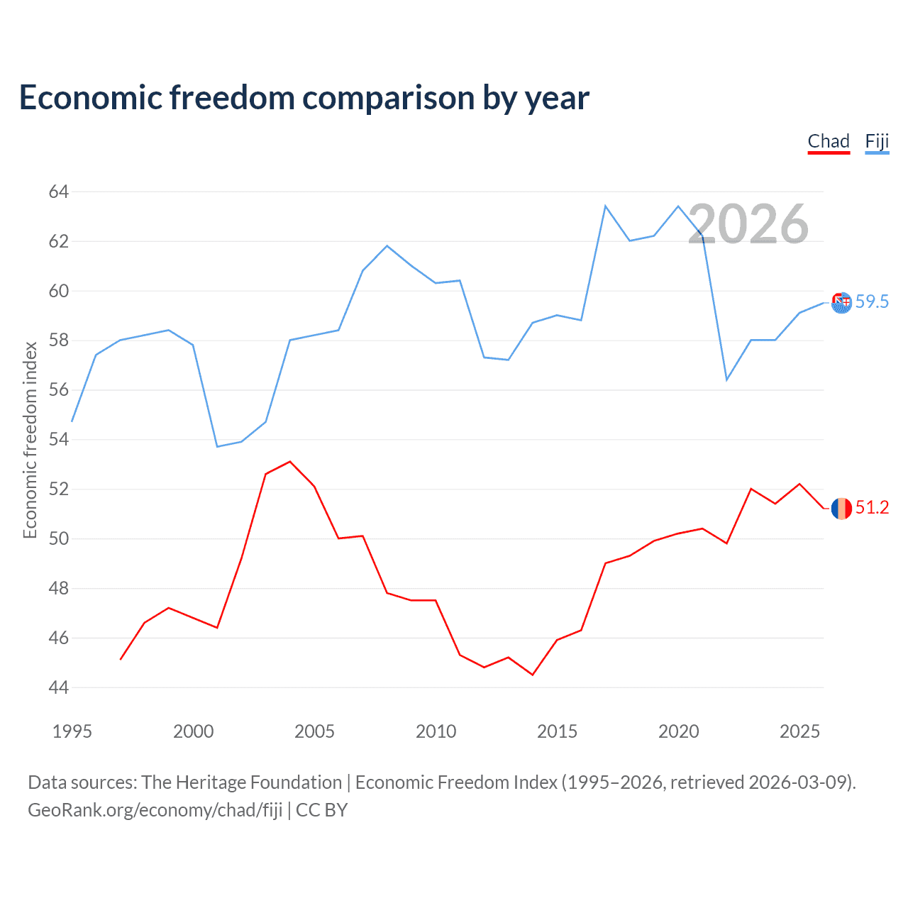 The Economic Freedom Index for Chad is 51.2, ranking 154/197, compared to 59.5 for Fiji, ranking 103/197. The chart above displays a comparison of annual changes in economic freedom indexes.