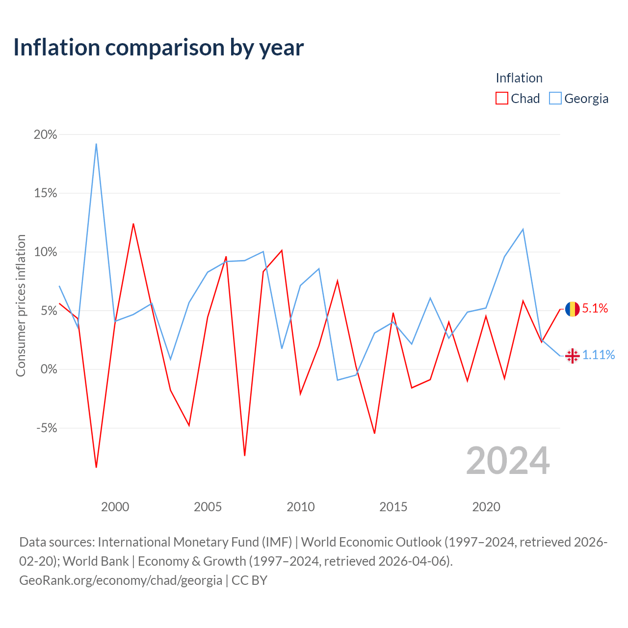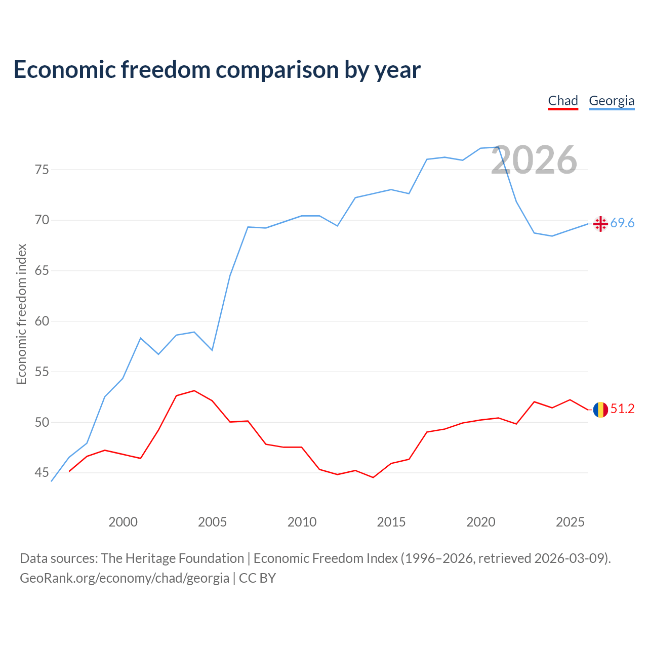 The Economic Freedom Index for Chad is 51.2, ranking 154/197, compared to 69.6 for Georgia, ranking 41/197. The chart above displays a comparison of annual changes in economic freedom indexes.