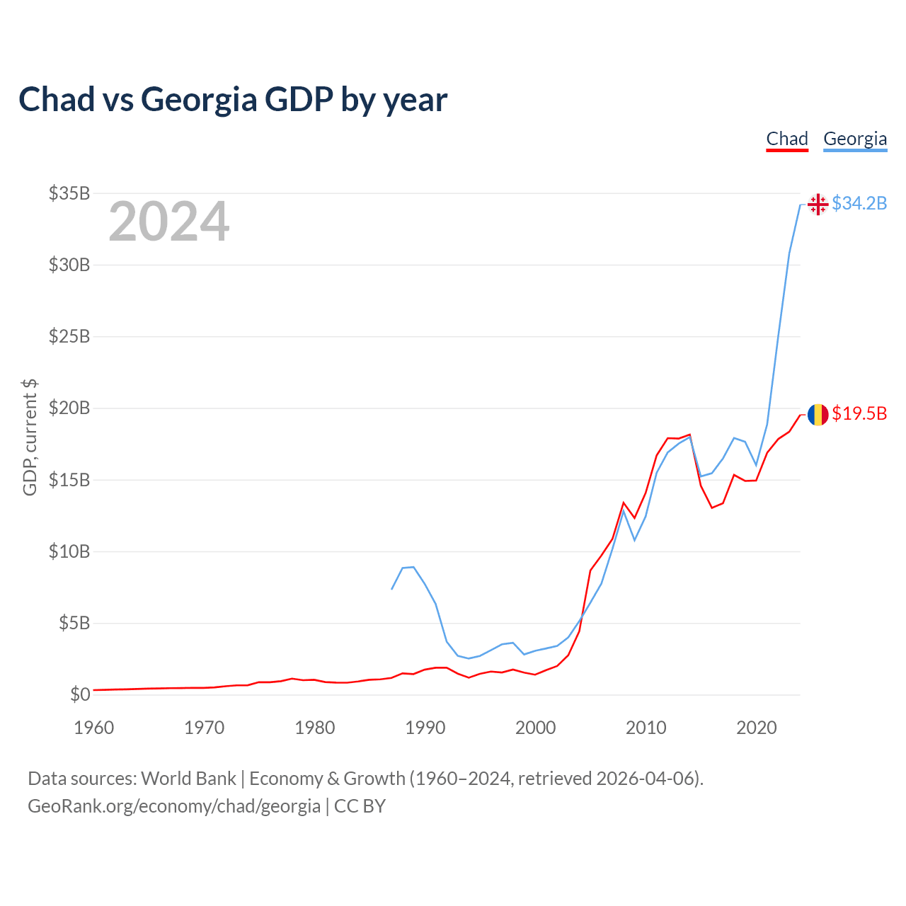 Chad has a GDP of $19.5B compared to $34.2B for Georgia, ranking 132/197 and 107/197 by economy size, respectively.