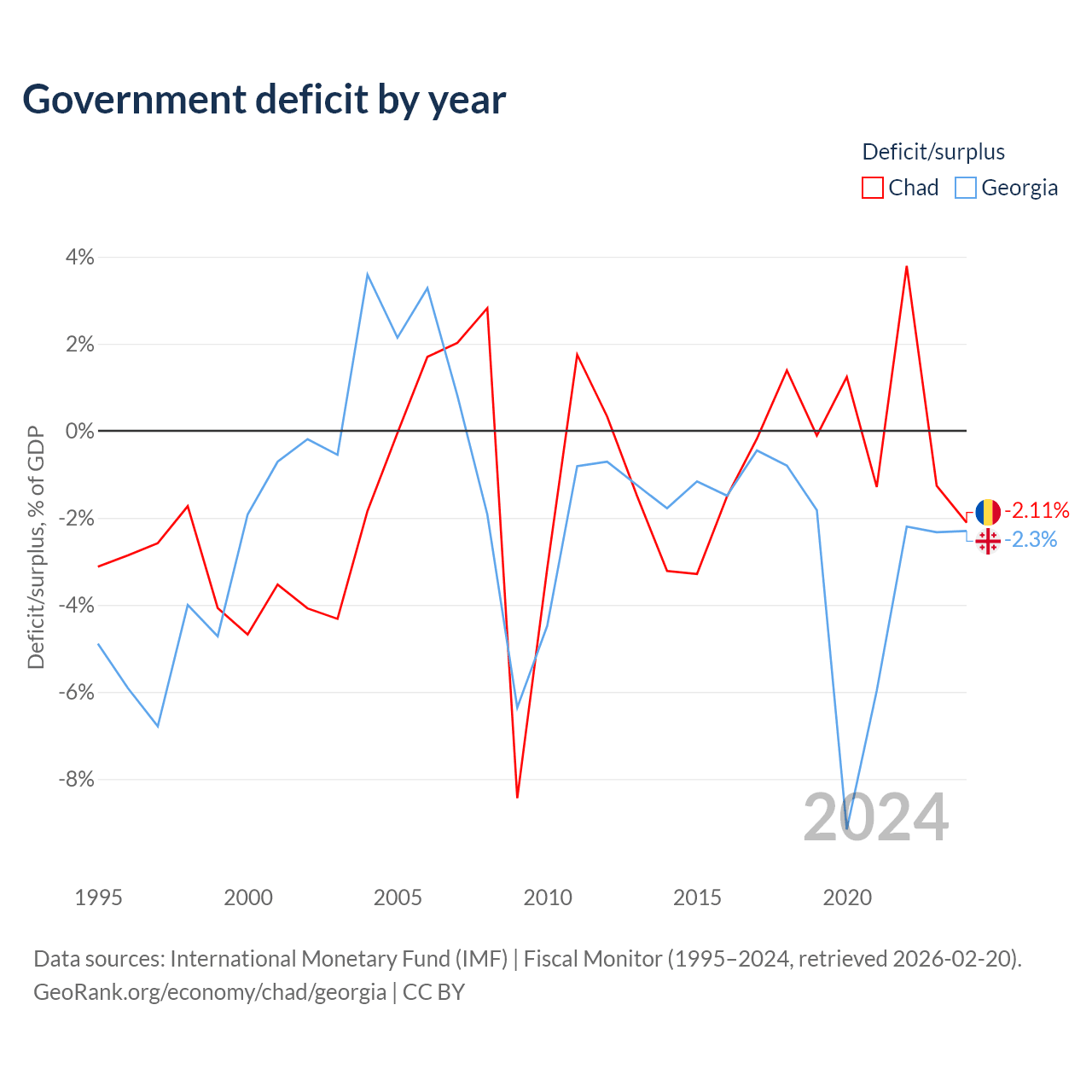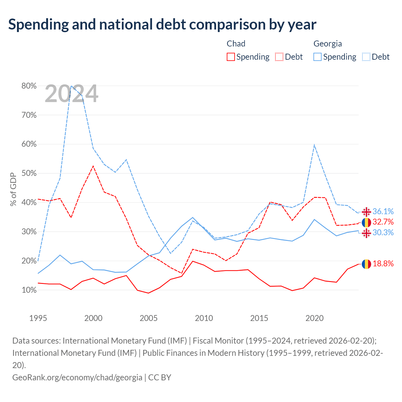 Chad has $6.37B in government debt (32.7% of GDP), compared to $12.3B (36.1% of GDP) in Georgia.