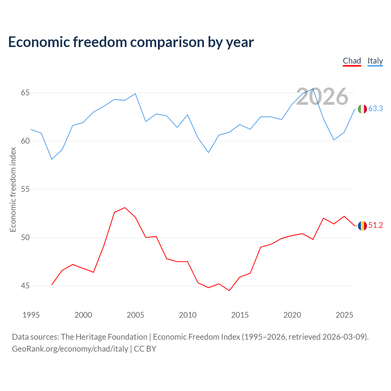 The Economic Freedom Index for Chad is 51.2, ranking 154/197, compared to 63.3 for Italy, ranking 80/197. The chart above displays a comparison of annual changes in economic freedom indexes.
