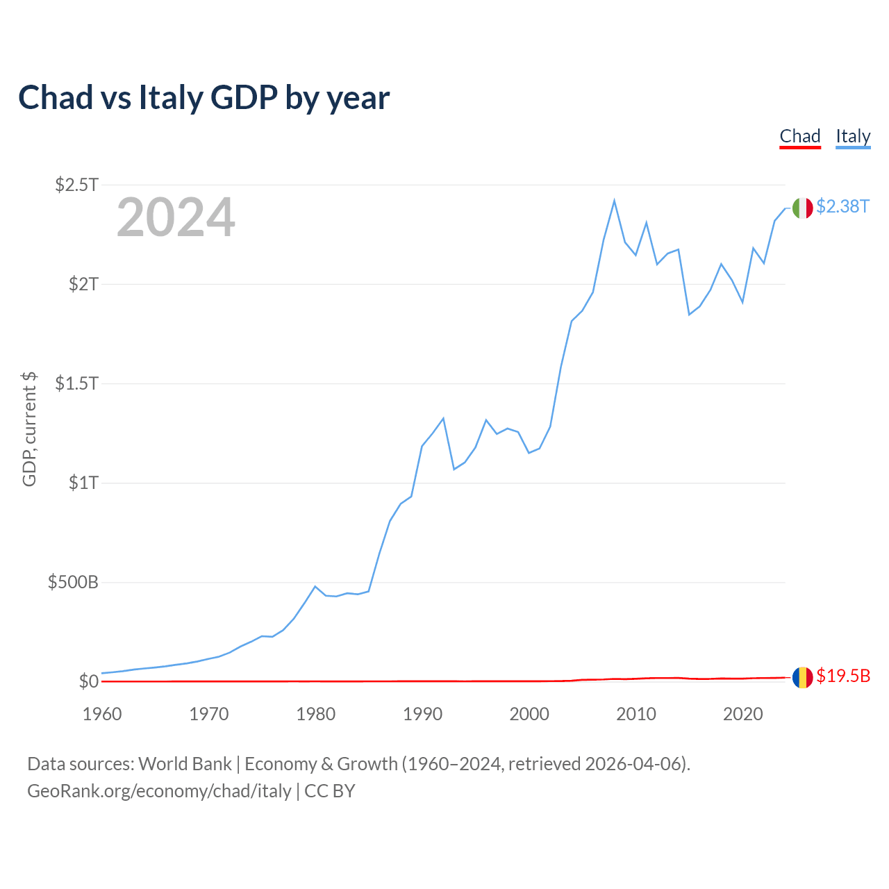 Chad has a GDP of $19.5B compared to $2.38T for Italy, ranking 132/197 and 8/197 by economy size, respectively.