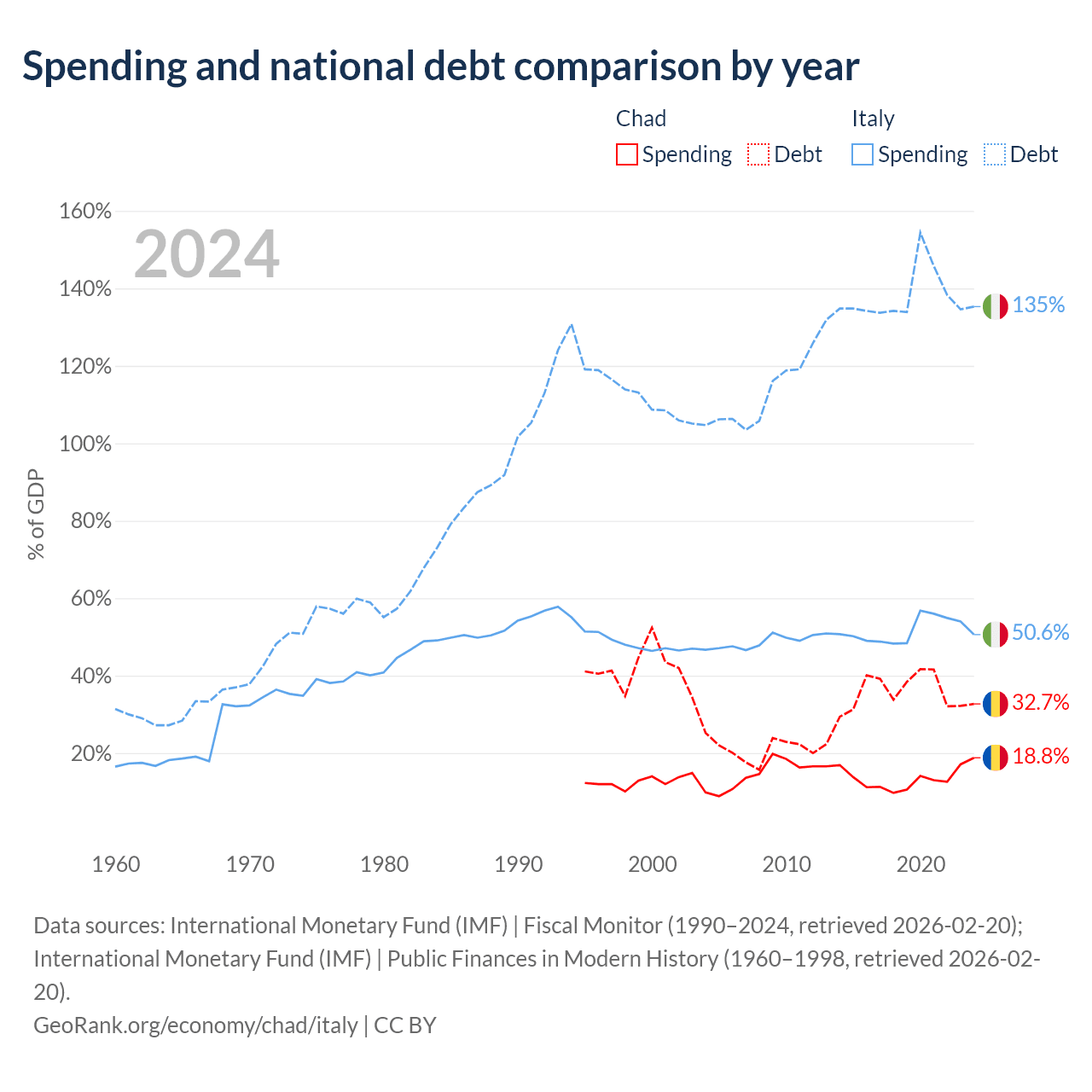 Chad has $6.37B in government debt (32.7% of GDP), compared to $3.22T (135.3% of GDP) in Italy.