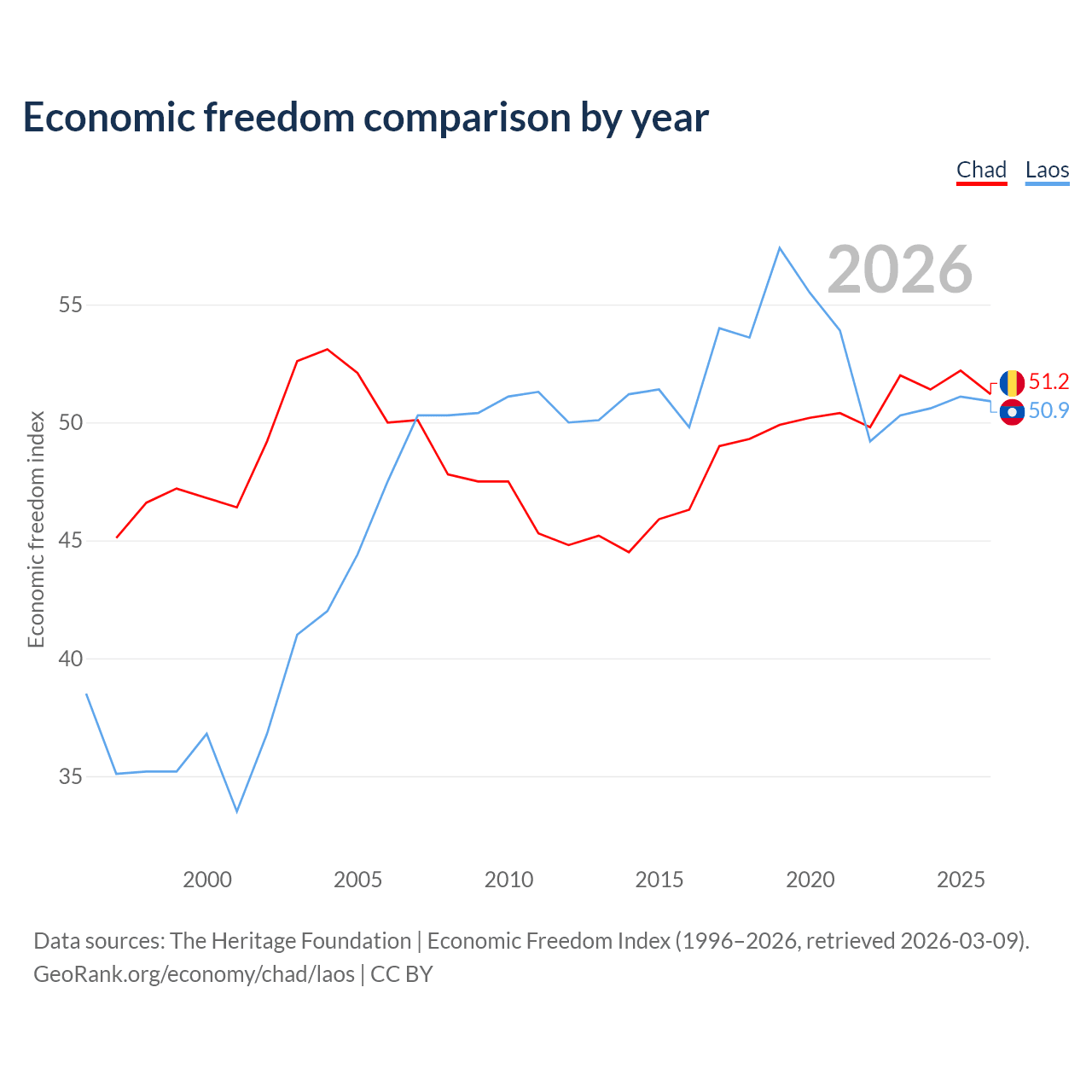 The Economic Freedom Index for Chad is 51.2, ranking 154/197, compared to 50.9 for Laos, ranking 157/197. The chart above displays a comparison of annual changes in economic freedom indexes.