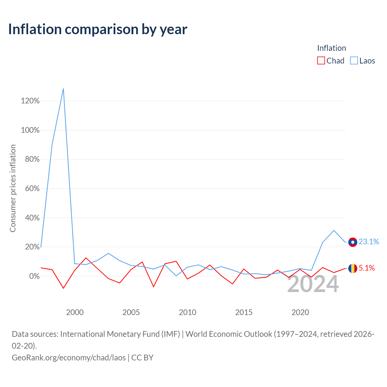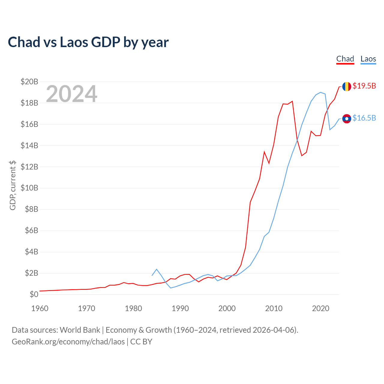 Chad has a GDP of $19.5B compared to $16.5B for Laos, ranking 132/197 and 139/197 by economy size, respectively.