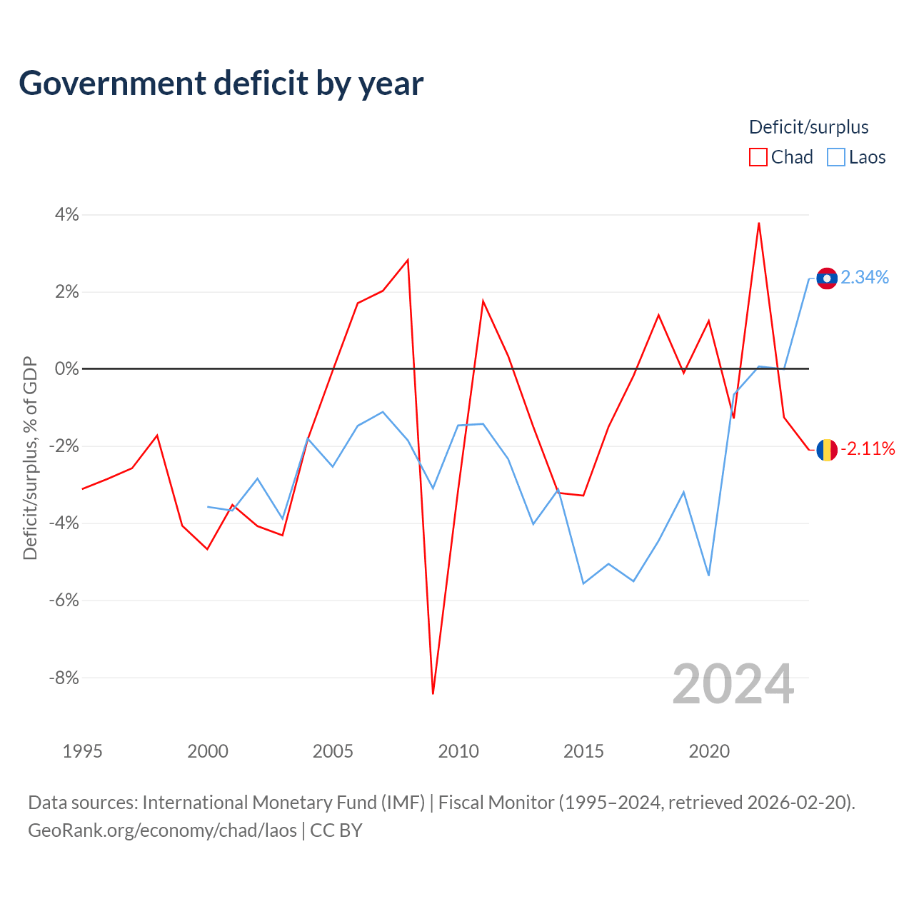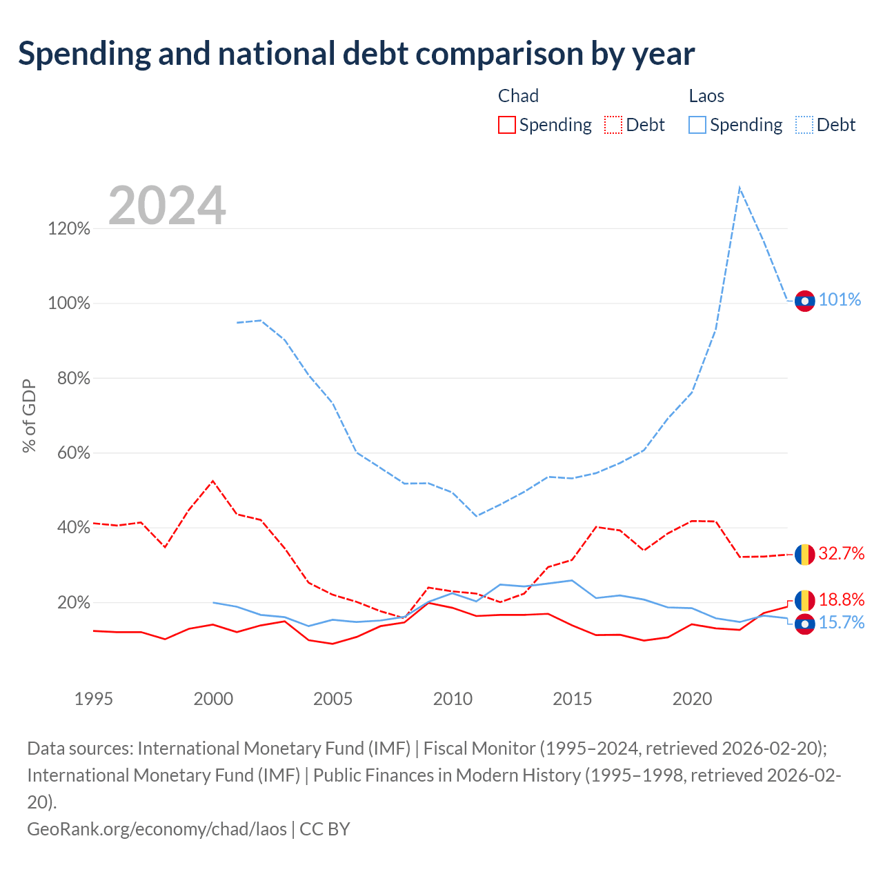 Chad has $6.37B in government debt (32.7% of GDP), compared to $16.6B (100.5% of GDP) in Laos.