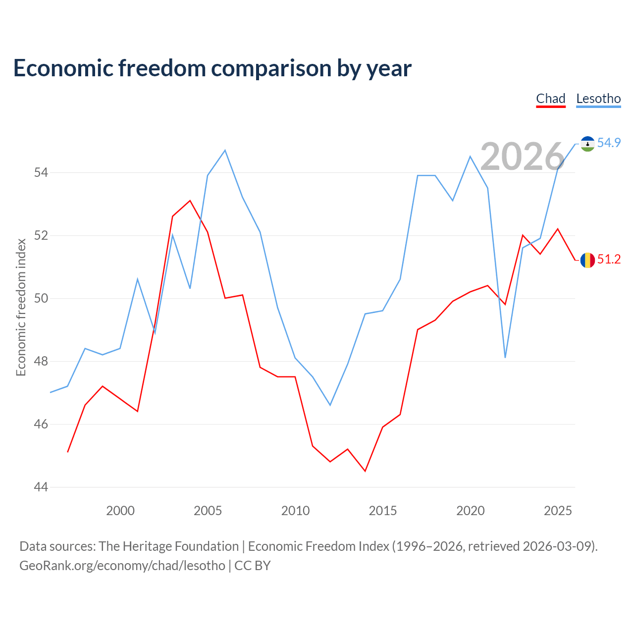 The Economic Freedom Index for Chad is 51.2, ranking 154/197, compared to 54.9 for Lesotho, ranking 130/197. The chart above displays a comparison of annual changes in economic freedom indexes.