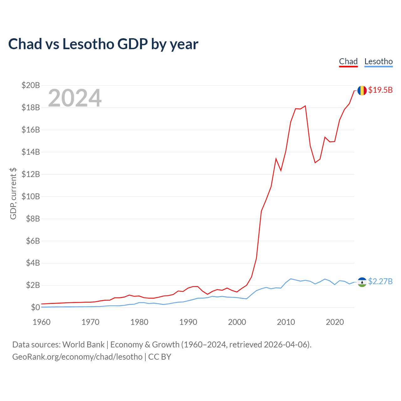 Chad has a GDP of $19.5B compared to $2.27B for Lesotho, ranking 132/197 and 175/197 by economy size, respectively.