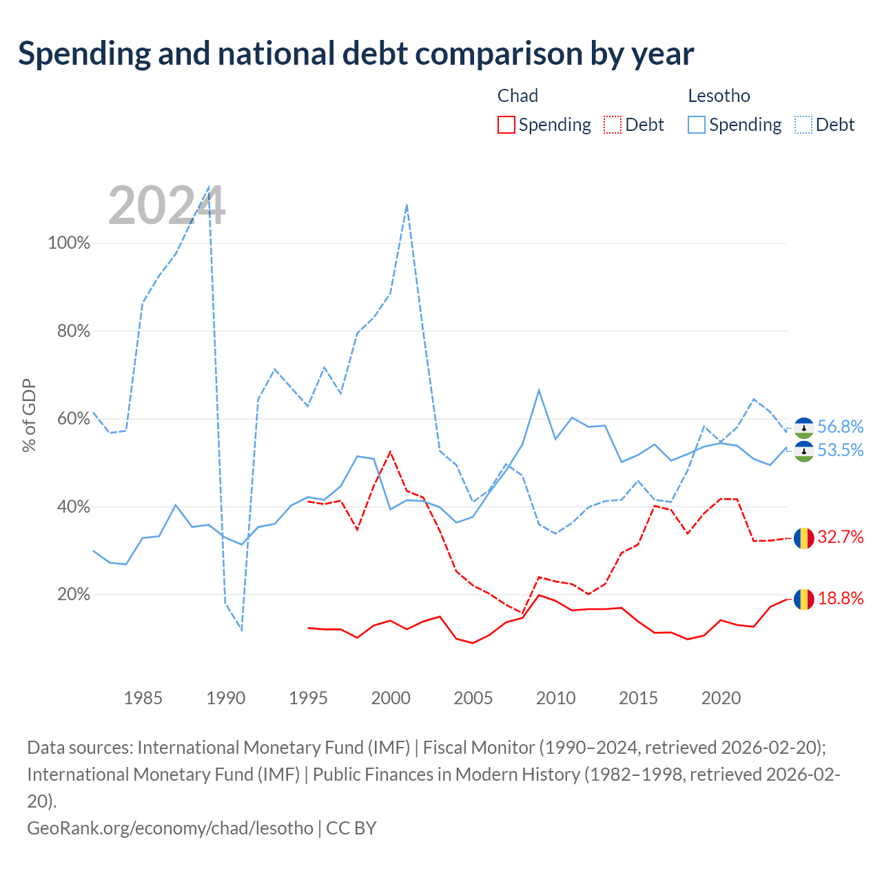 Chad has $6.37B in government debt (32.7% of GDP), compared to $1.29B (56.8% of GDP) in Lesotho.