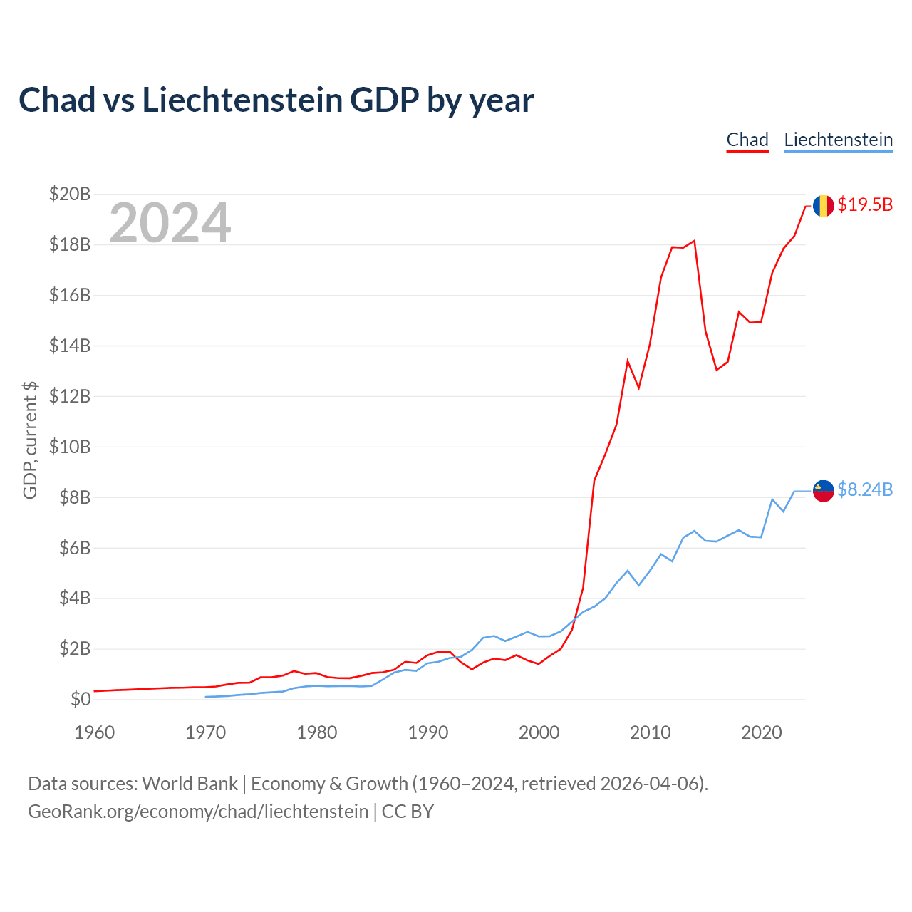 Chad has a GDP of $19.5B compared to $8.24B for Liechtenstein, ranking 132/197 and 156/197 by economy size, respectively.