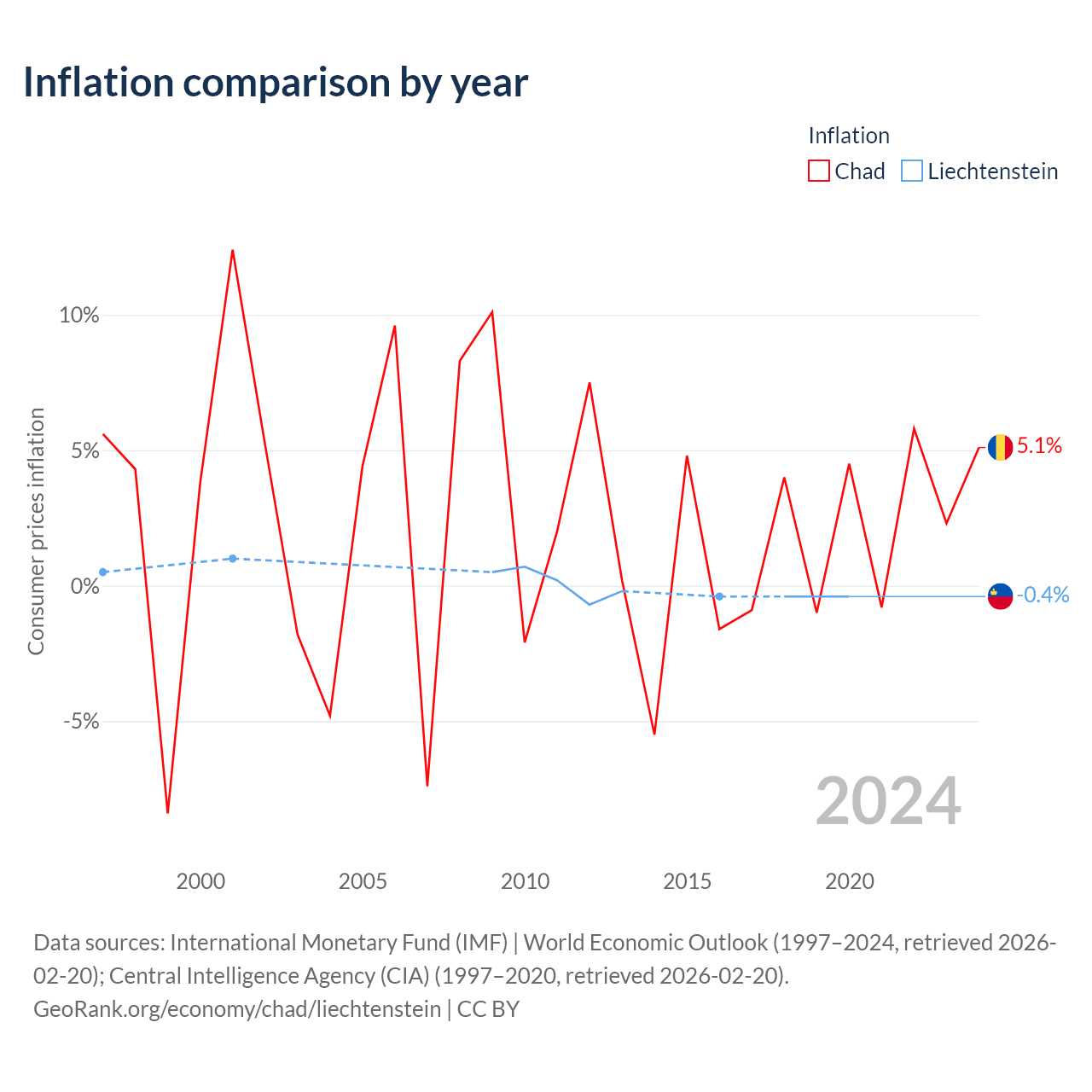 Over the past 24 years, Chad has recorded an average annual inflation rate of 2.22%, compared with 0.04% in Liechtenstein. In 2020, inflation was 5.1% in Chad and -0.4% in Liechtenstein.