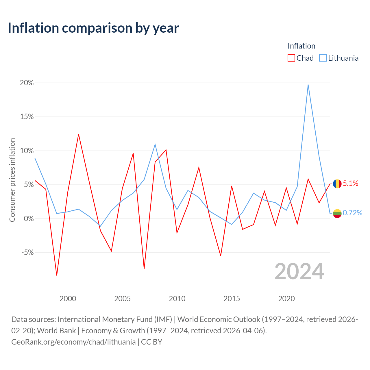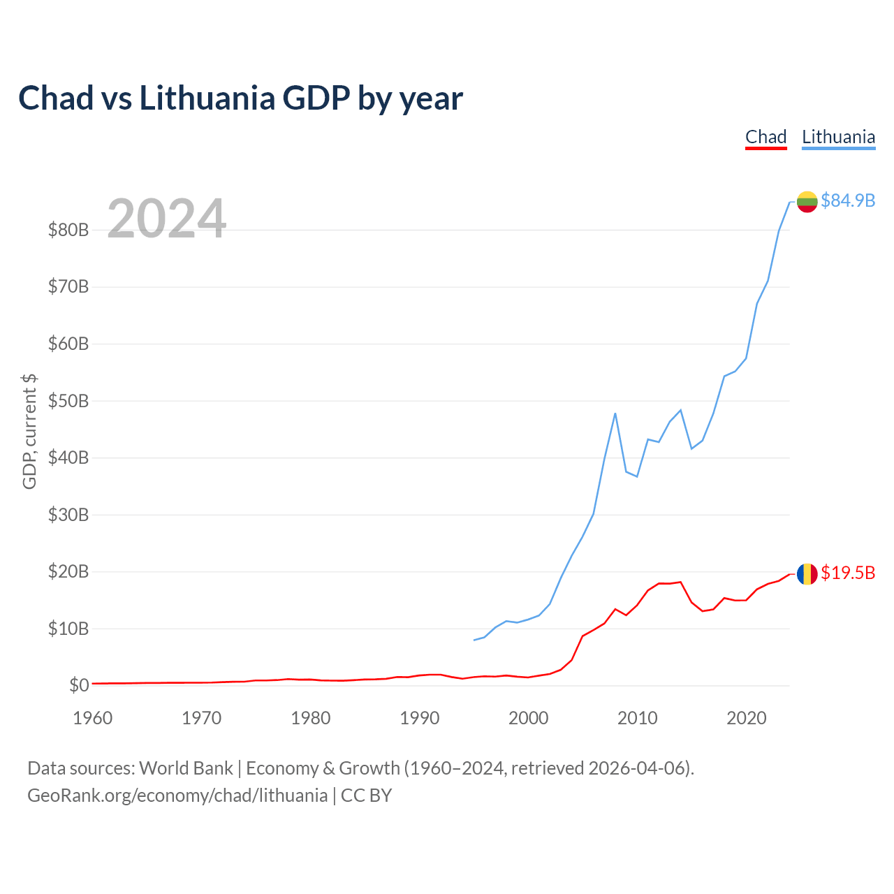 Chad has a GDP of $19.5B compared to $84.9B for Lithuania, ranking 132/197 and 79/197 by economy size, respectively.