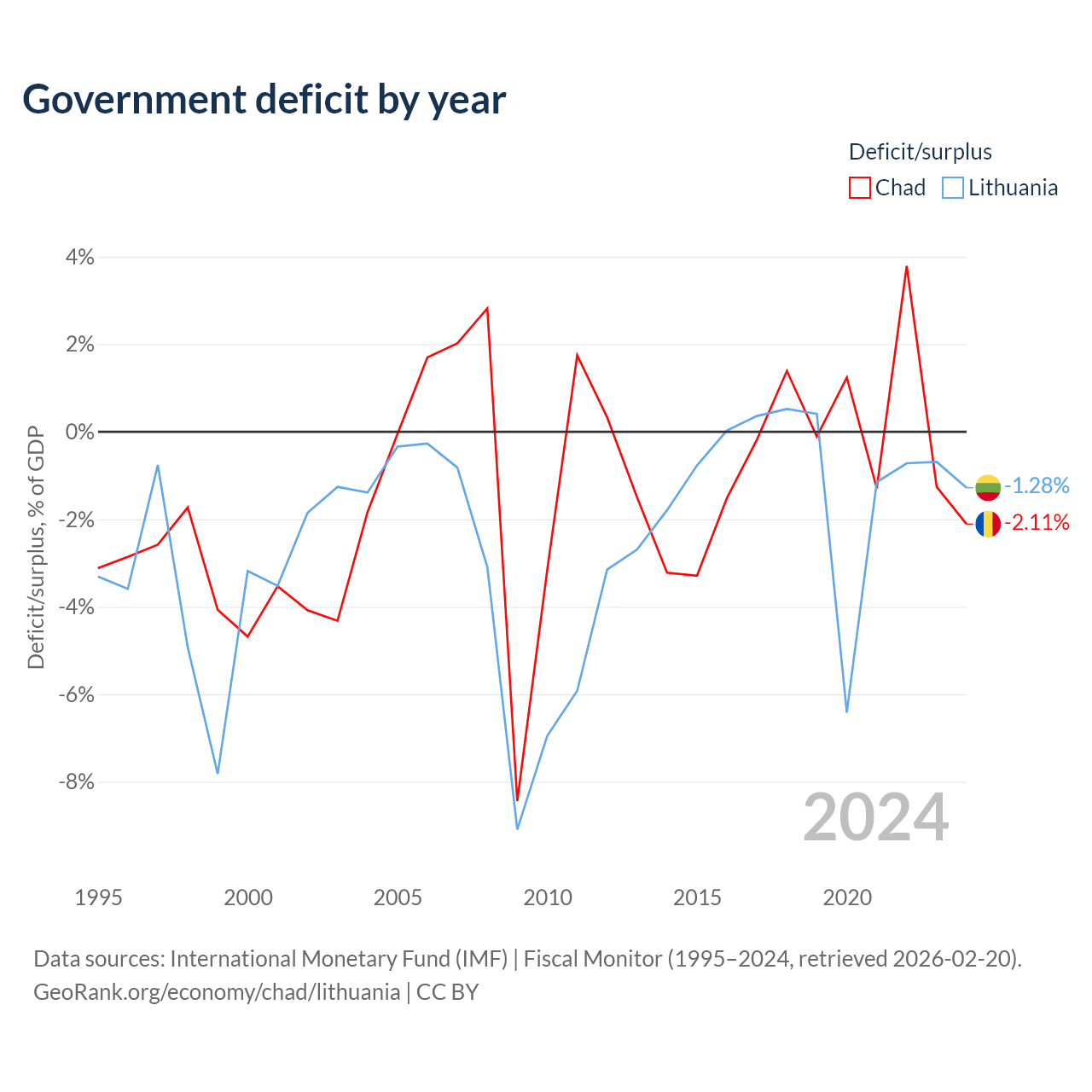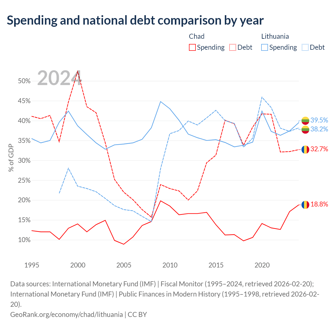 Chad has $6.37B in government debt (32.7% of GDP), compared to $32.4B (38.2% of GDP) in Lithuania.