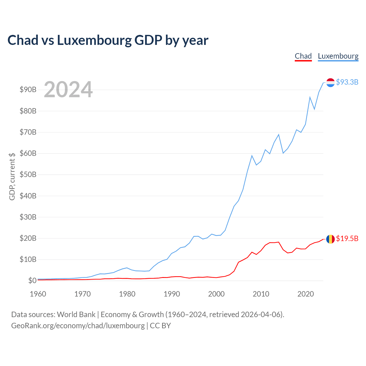 Chad has a GDP of $19.5B compared to $93.3B for Luxembourg, ranking 132/197 and 74/197 by economy size, respectively.